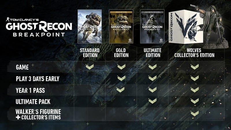 „Ghost Recon: Breakpoint“ erscheint in fünf verschiedenen Editionen: Standard, Gold, Uplay+, Ultimate und Wolves Collectors Edition. Diese locken mit unterschiedlichen Inhalten, alle bringen aber diese Vorbesteller-Boni mit sich: