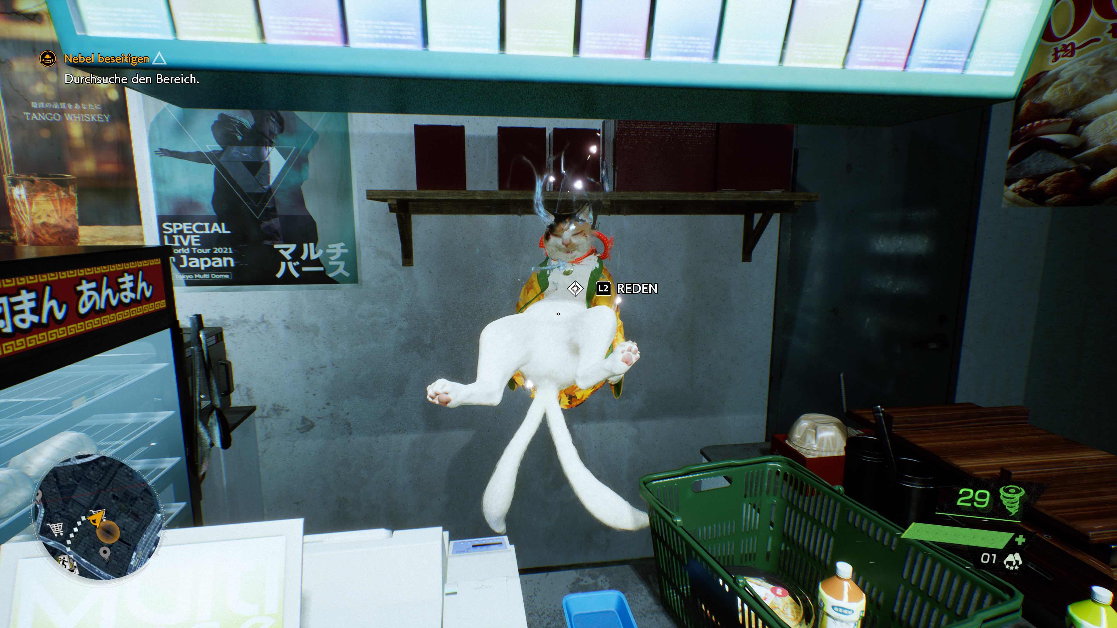 Geblieben sind nur Hunde und Katzen, die wir streicheln können und die uns kurze Dialogzeilen bescheren. Auch die vielen kleinen Supermärkte wurden von schwebenden, zweischwänzigen Yokai-Katzen übernommen, dazu streifen überall die gruseligen Besucher in Form von gesichtslosen Anzugträgern oder Schulmädchen ohne Kopf herum. Nicht nur einmal fühlte ich mich beim Erkunden von Tokio, als wäre ich in einem Roman des japanischen Autors Haruki Murakami hineingeraten.