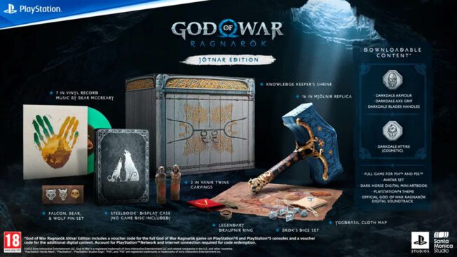 Die umfangreichere Jötnar-Edition besitzt darüber hinaus Broks-Würfelset, eine Yggdrasil-Stoffkarte, einen Draupnir-Ring und eine Vinyl-Schallplatte mit Musik von Bear McCreary, der den Soundtrack zu den beiden aktuellen „God of War“-Spielen beisteuert.