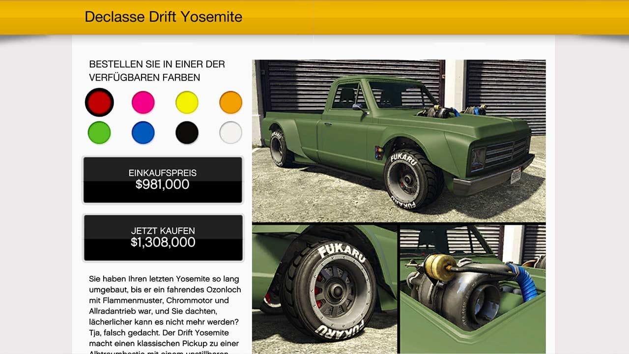 Um den Drift Yosemite zum Einkaufspreis von 981.000 GTA-Dollar erwerben zu können, müsst ihr mit dem Fahrzeug im Vorfeld das Diamond-Casiono-Raubüberfallfinale als Anführer abschließen.