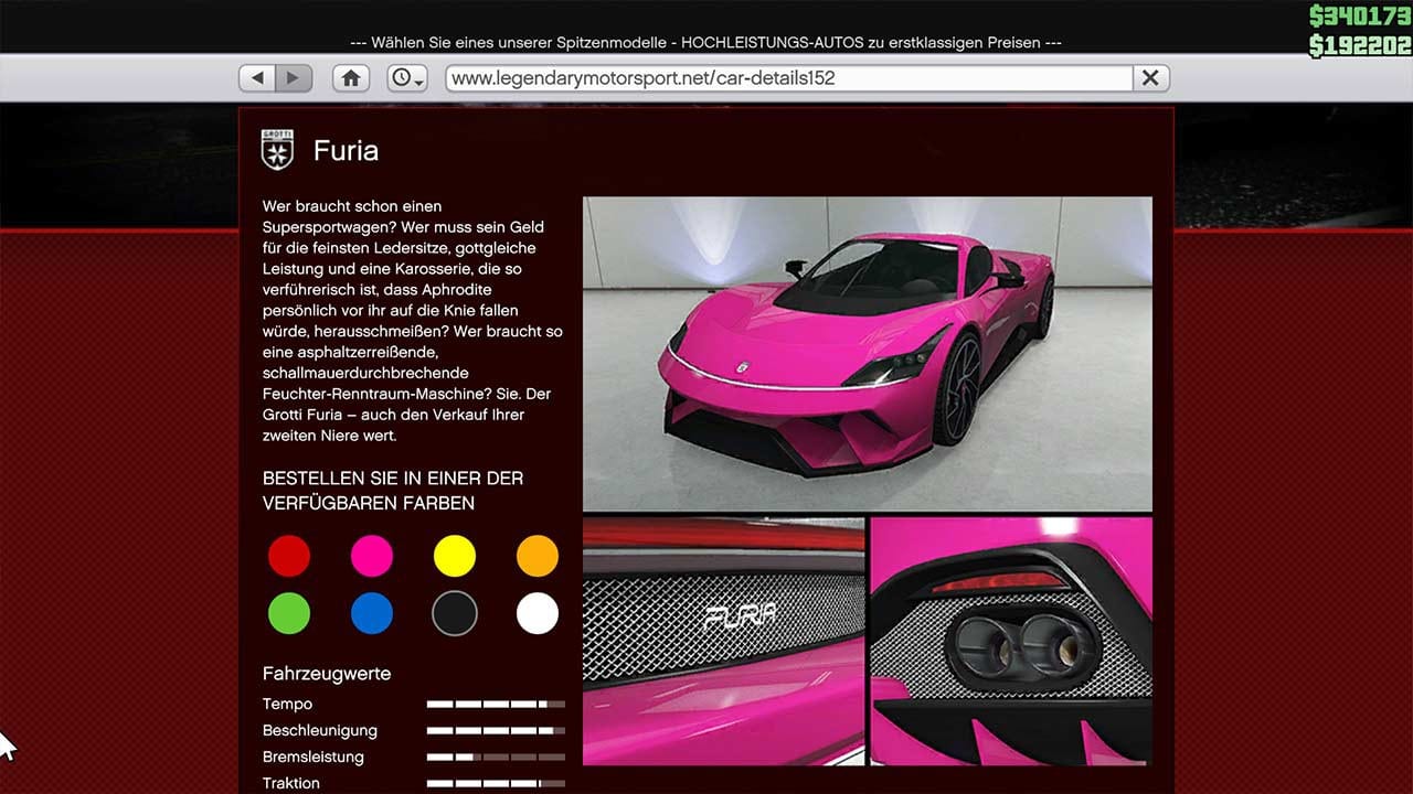 „Wer braucht schon einen Supersportwagen? Wer muss sein Geld für die feinsten Ledersitze, gottgleiche Leistung und eine Karosserie, die so verführerisch ist, das Aphrodite persönlich vor ihr auf die Knie fallen würde, herausschmeißen? Wer braucht so eine asphaltzerreißende Feuchter-Renntraum-Maschine? Sie. Der Grotti Furia – auch den Verkauf Ihrer zweiten Niere wert.“