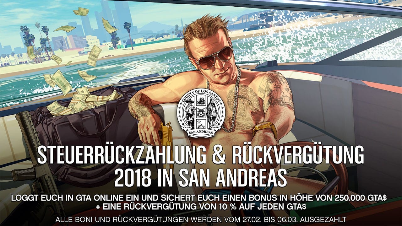 Auch in Rockstar Games Open-World-Titel GTA Online gibt es ein Finanzamt, weshalb ihr ab sofort eine saftige Steuerrückzahlung erwarten dürft. Dafür musstet ihr euch lediglich zwischen dem 16. und 26. Februar im Spiel einloggen. Solltet ihr in diesem Zeitraum in GTA Online außerdem Geld ausgeben haben, erhaltet ihr für jeden bezahlten Dollar zehn Prozent zurück – bis zu einer Gesamtsumme von einer Million GTA-Dollar.