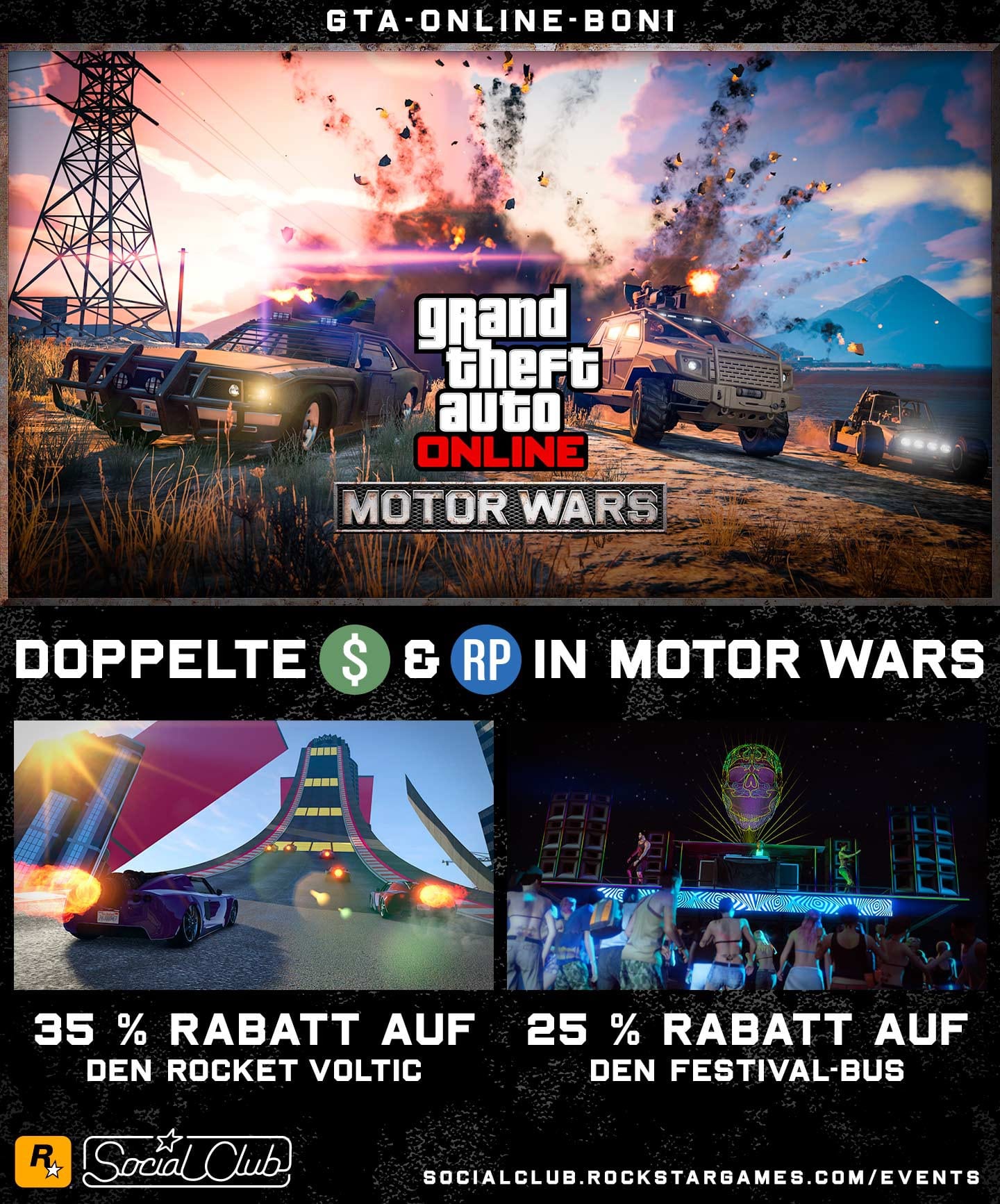 Der rasende Kampf ums Überleben in Motor Wars ist diese Woche zweimal so lukrativ mit doppelten GTADollar- und RP-Auszahlungen bis zum 10. Dezember. Tut euch mit einem Team von ebenso schlecht ausgerüsteten Ausgestoßenen zusammen und kratzt Munition und Waffenfahrzeuge auf dem Schlachtfeld zusammen, während ihr versucht, die Laberköpfe des gegnerischen Teams zu beseitigen.