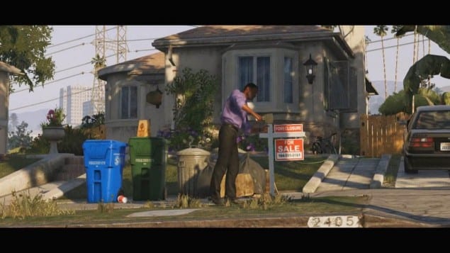 Grand Theft Auto V spielt erneut in San Andreas, welches diesmal noch detaillierter und noch umfangreicher ausfallen wird. Besonders im Trailer präsentiert wurde „Vinewood“, welches die virtuelle Darstellung von Los Angeles‘ Hollywood-Bezirk ist und gleichzeitig auch die Großstadt der Landschaft darstellt. Hier finden wir neben vielen Wolkenkratzern auch eine typisch-amerikanische Strandpromenade, ein gemütliches, mittelständiges Wohnviertel, ein hochwertiges Villenviertel und natürlich auch eine Art „Bronx“, in welcher Obdachlose die Straßen besiedeln. Grand Theft Auto V greift dabei einige aktuelle Themen auf, wie etwa die Immobilien-Inflation oder die Wirtschaftskrise. Im Trailer sind beispielsweise stolze Hausbesitzer zu sehen, welche ihre Immobilien zum Verkauf freigeben. Man könnte dadurch vermuten, dass man erneut befugt ist, Anwesen zu kaufen, ähnlich wie es bereits in älteren Titeln der Kultserie möglich war.