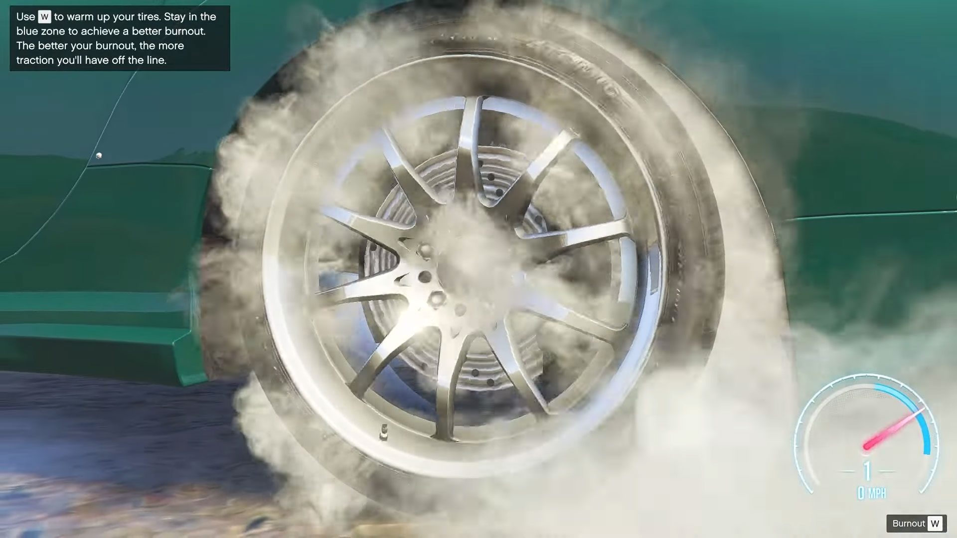 Zu Beginn eines Rennens müsst ihr innerhalb eines Minispiels eure Reifen aufwärmen, um für den Start mehr Traktion und somit auch besseren Grip zu erhalten. Extra für die neuen Drag-Rennen hat Rockstar eine entsprechende Anzeige eingebaut, die in der rechten unteren Bildschirmhälfte platziert wurde. Hier muss der Zeiger im blauen Bereich verbleiben, um einen besseren Burnout und somit bessere Startbedingungen zu erhalten.