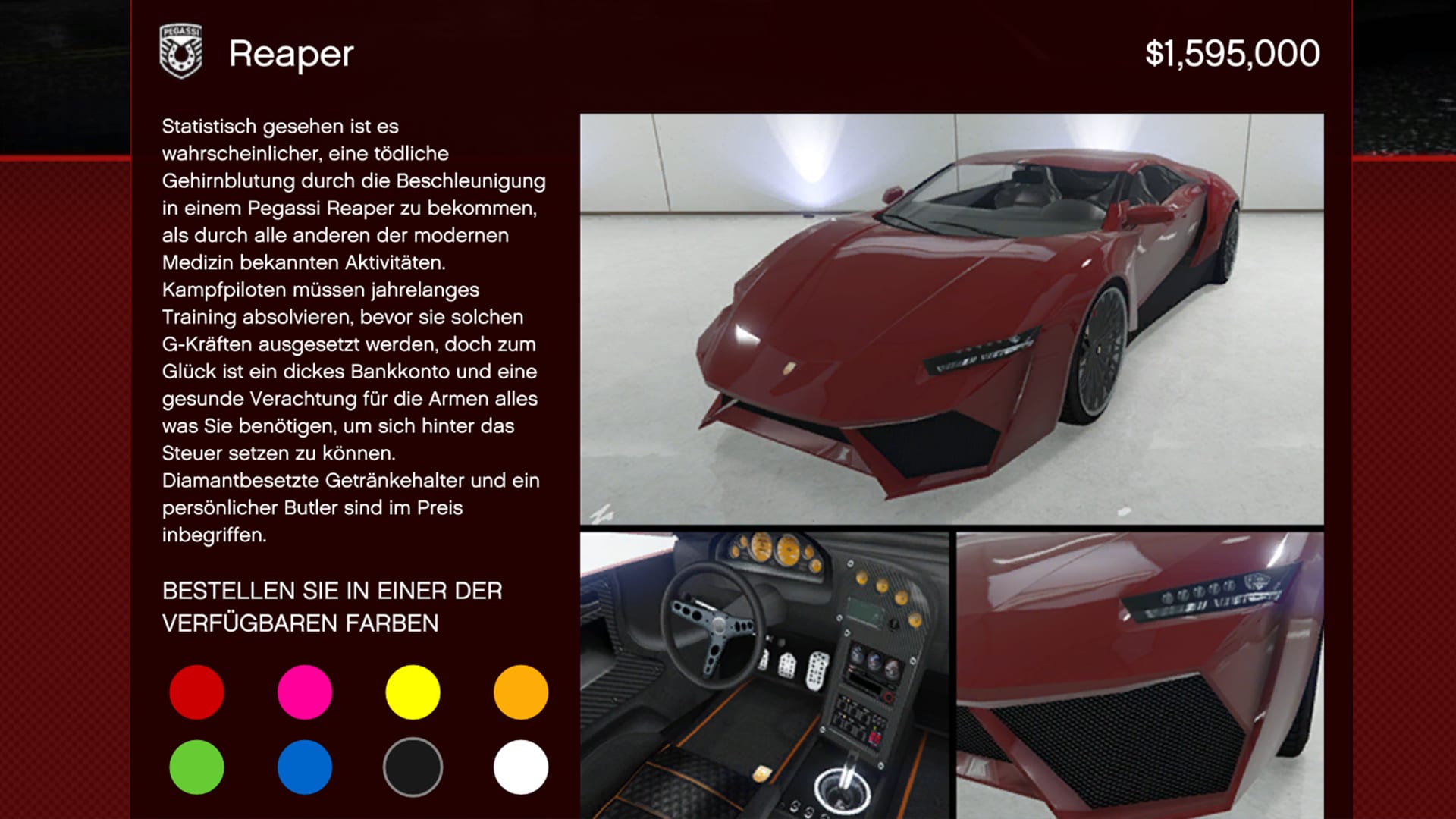 Welches Gefährt ihr im Casino gewinnen könnt, ändert sich jede Woche aufs Neue. In dieser Woche steht den Supersportwagen Pegassi Reaper auf dem Podium (Preisfahrzeug). Regulär könnt ihr das Fahrzeug im Spiel bei Legendary Motorsport für $1.595.000 erwerben.