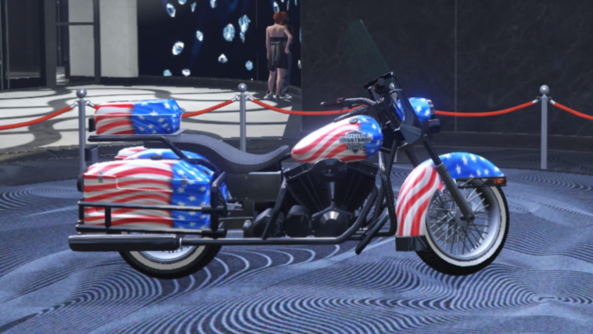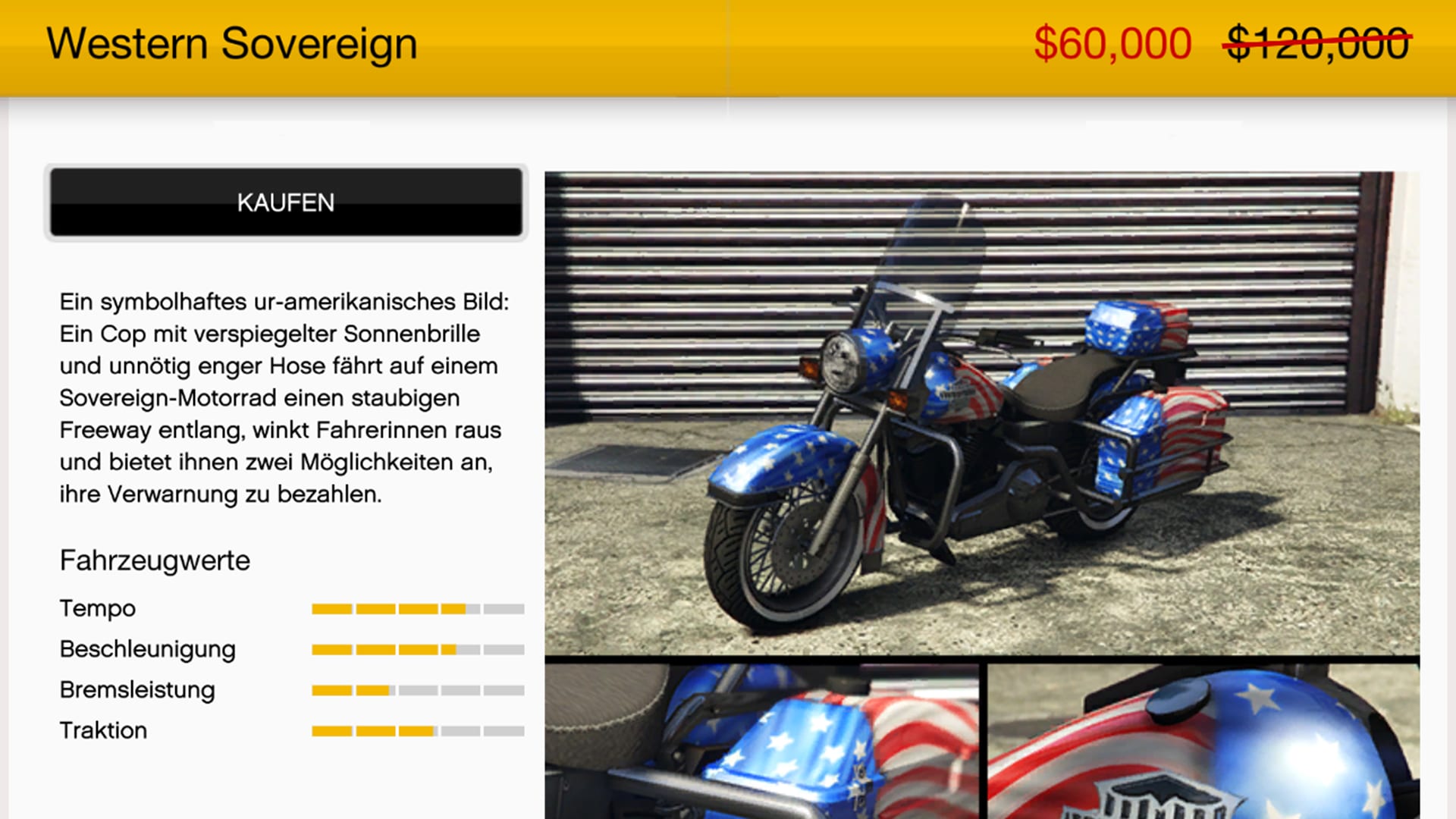 Welches Gefährt ihr im Casino gewinnen könnt, ändert sich jede Woche aufs Neue. In dieser Woche steht das Motorrad Sovereign auf dem Podium (Preisfahrzeug), das im Rahmen des Independence Day Special-Updates in das Spiel integriert wurde. Regulär könnt ihr das Motorrad bei Southern San Andreas Super Auto zum Preis von $120.000 erwerben. Derzeit könnt ihr das Zweirad allerdings um 50 Prozent reduziert erwerben und müsst somit lediglich $60.000 zahlen.
