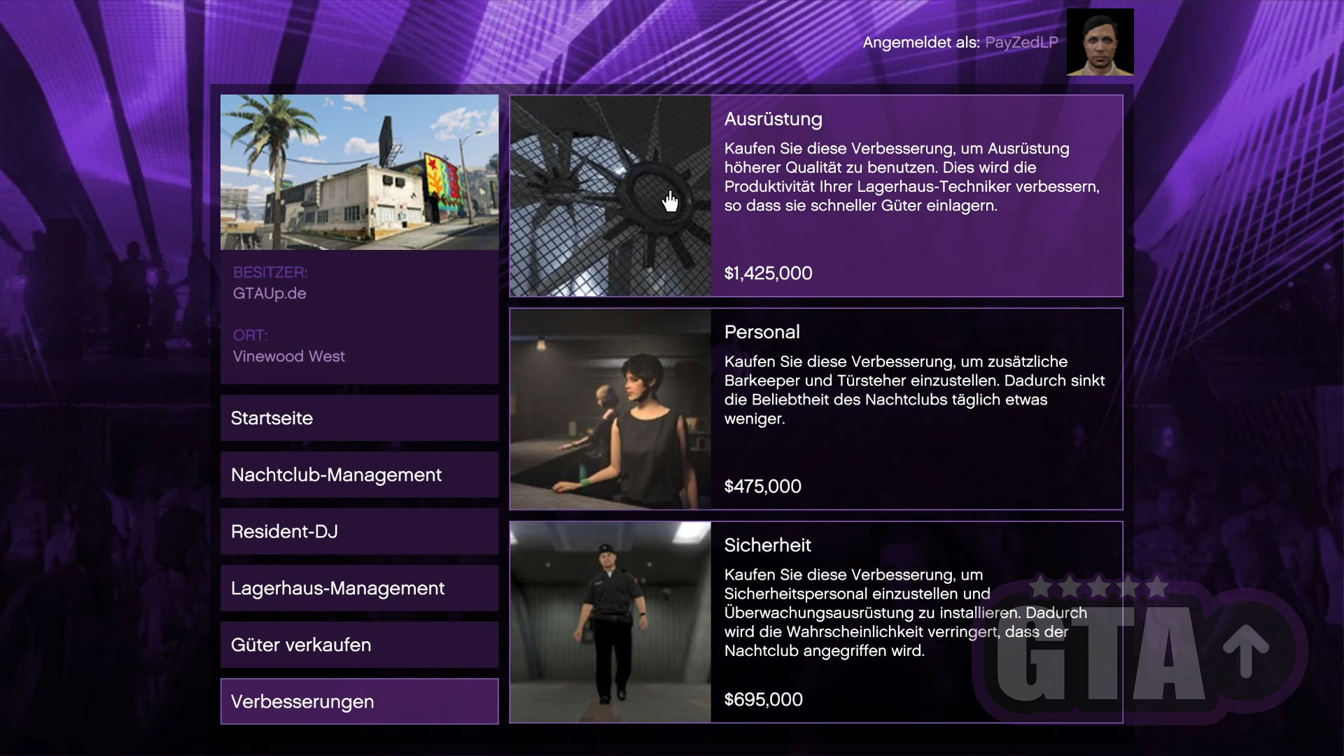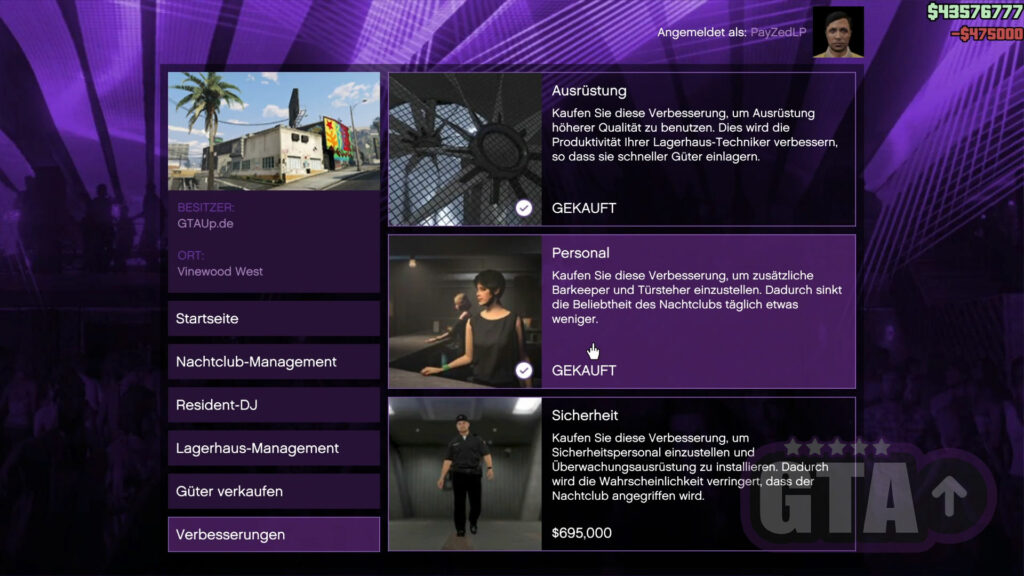 Als erstes solltet ihr aber in das Personal-Upgrade investieren, das ihr ebenfalls über den Computer im Büro des Nachtclubs findet. Über den Reiter Verbesserungen kauft ihr das zweite Upgrade mit der Bezeichnung Personal für 475.000 GTA-Dollar.