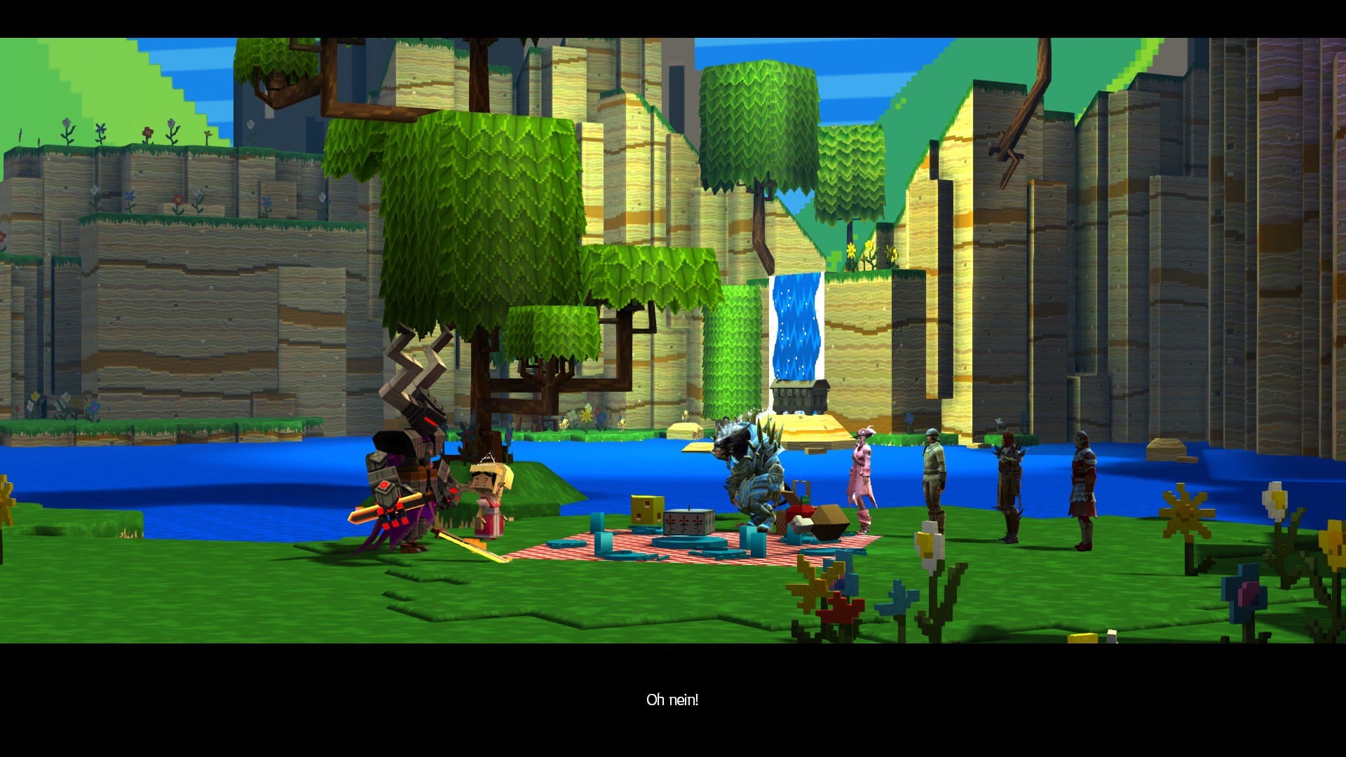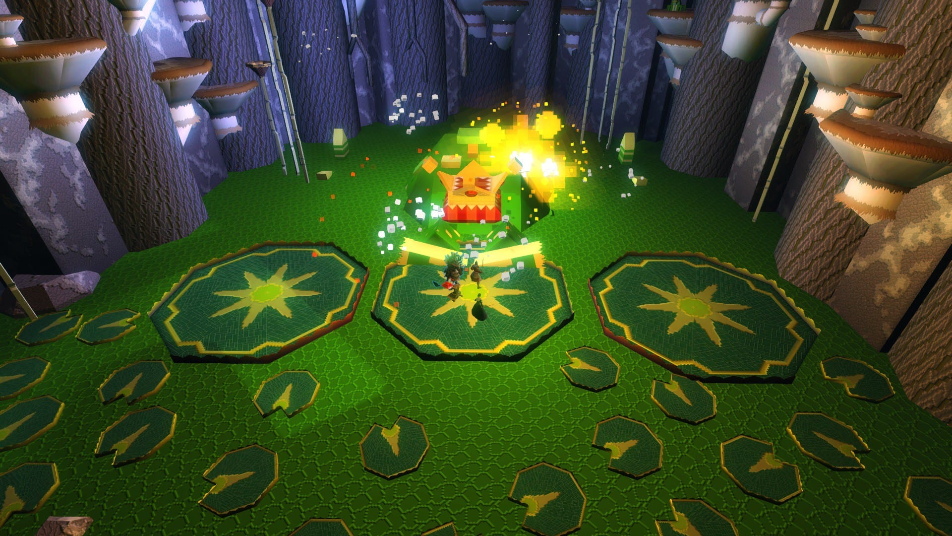 Auch sonst lohnt sich der Einstieg in eine Gruppe, weil gerade erfahrenere Fans der Adventure Box Neulinge an die Hand nehmen und auch den Weg zu den teils gut versteckten Shops weisen. Deren Erkundung braucht es beispielsweise für Erfolge. Der Zusammenhalt als Team erleichtert zudem den Kampf gegen Zwischenbosse, die mit vielen Sphären-Münzen belohnen. Spätestens beim Endkampf will man nicht mehr als Individuum vor die Hunde gehen. Auch hier reicht im normalen Modus der Anspruch übrigens von kinderleicht bis mittelschwer. Anfänglich will in Welt 1 Zone 1 lediglich ein Käfig zerschlagen werden. In Zone 3 aber begegnet die Truppe bereits einem gigantischen Frosch, dessen Umgebung ein Sumpf ist. Und spätestens seit diesem Artikel wissen wir alle, was es bedeutet, in diesen hinein gestampft zu werden. Spaß machen die Mechaniken auf alle Fälle – und auch der finale Endkampf gegen den Sturmzauberer bereit Freude. Gerade die Überraschungsmomente sorgen dank der entsprechenden Vertonung für Gelächter. So scheint der alte Magier es ab einem gewissen Zeitpunkt wie wild auf die Mitspieler abgesehen zu haben. Da klopft der Sensenmann oft schon an der Tür.