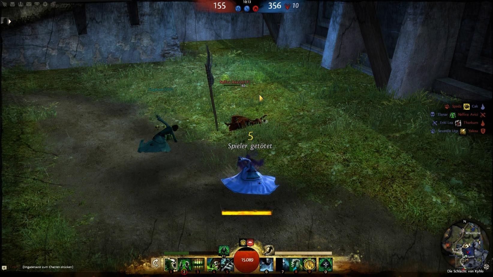 Doch warum ist der Kampf von Spieler zu Spieler so wichtig für Guild Wars 2 und nimmt eine, wenn nicht gar DIE zentrale Rolle im neuen MMO-Blockbuster von ArenaNet ein? Zuerst darf man bereits als frischer Neuling ab Stufe zwei die Zentrale des PvP betreten. Im Gebiet selbst findet ihr euch dann in den Nebeln wieder. Diese mystische Bezeichnung birgt zwei Besonderheiten: Zum einen ist hier jeder Spieler gleich, werdet ihr doch sofort auf das maximale Level (80) gesetzt und habt freien Zugriff auf verschiedene Ausrüstungsgegenstände, zum anderen dürft ihr hier ausgiebig verschiedene Einstellungen und Charakterkonfigurationen testen und über den PvP-Browser direkt in bestimmte Gefechte einsteigen. Wem das zu lange dauert, der hat auch die Möglichkeit des Soforteinstiegs und wird auf eine zufällige Karte geschickt. Ob ihr also zwanglosen Spaß oder organisierte Action sucht, ihr kommt in jedem Falle auf eure Kosten und dürft spannende Kämpfe der Marke eins-gegen-eins bis zehn-gegen-zehn erwarten. Besonderen Flair erhält eine Auseinandersetzung dann auch gerne, wenn ihr oder einer eurer Kontrahenten angeschlagen am Boden liegt. Hier macht Guild Wars 2 einen gewagten Schritt und lässt besiegte Feinde nicht sofort sterben. Auch im niedergerungenem Zustand stehen euch nämlich noch immer vier Fertigkeiten zur Auswahl, mit denen ihr euch zur Wehr setzen könnt und, falls ihr in diesem Zustand einen Gegner töten könnt, dürft ihr eure Kräfte sogar nochmals sammeln und seid wieder voll und ganz im Gefecht zurück. Dies kann nur mit einem endgültigen Tod des am Boden liegenden Charakters unterbunden werden, wofür die Entwickler spezielle „Finisher“ implementiert haben. Mit diesen versetzt ihr auch angeschlagenen Feinden dann recht flott den finalen Gnadenstoß.