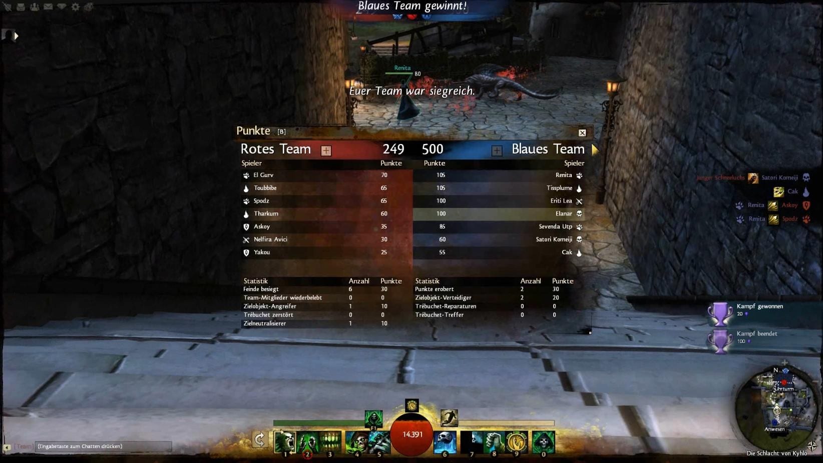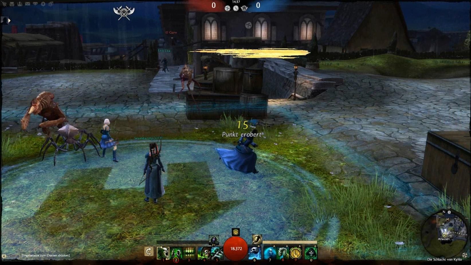 Im Grunde genommen gibt es bisher nur einen Spieltyp unter der Bezeichnung „Eroberung“. Dieser existiert jedoch, wie zu Beginn dieses Artikels bereits erwähnt, auf verschiedenen Karten in jeweils abgeänderter Form. Was sich dahinter verbirgt, ist schnell zusammengefasst: 500 Siegpunkte gilt es zu erringen, die Rahmenbedingungen sind bekannt und 15 Minuten bleiben eurem Team um zu gewinnen. Sollte die Punktegrenze nach Ablauf der Zeit nicht erreicht sein, so gewinnt das Team mit dem höchsten Punktestand. Besondere Punkte könnt ihr durch das Töten von starken Monstern auf bestimmten Karten erlangen. Diese fallen unter die Rubrik „Sekundärziele“ und stellen eine knifflige Herausforderung taktischer als auch spielerischer Natur dar. Nur das Team, welches sich sämtliche Facetten des PvP zu seinen Gunsten aneignet, hat eine Chance als Sieger vom Platz zu gehen. So treten oftmals taktische Fragen auf: Sollen wir den Punkt gemeinsam einnehmen und so schneller unter unsere Kontrolle bringen? Oder doch lieber verteilt ausschwärmen, um unter Umständen gleich alle Punkte erobern zu können? Ist der Gegner jedoch bereits in der Nähe, entfällt eine Eroberung eventuell komplett und man sollte auf ein Sekundärziel ausweichen. Taktische Tiefe ist also vorprogrammiert, doch ein paar Vögelchen zwitschern bereits fleißig von weiteren geplanten PvP-Modi. Vielleicht lässt sich ArenaNet ja noch etwas ganz Besonderes einfallen…