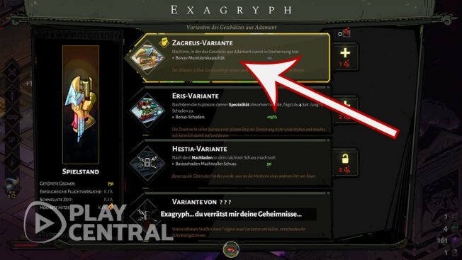 Wir wählen für unsere Fixkill-Strategie, die auf Fernkampfangriffen basiert, die Waffe: Exagryph in der Zagreus-Variante. Und ja, es ist möglich, Hades mit dem Exagryph ohne weitere Extras (wie anderen Varianten) zu besiegen. Denn essenziell sind viel mehr die Daedalus-Anpassungen und andere Details im Spielverlauf.