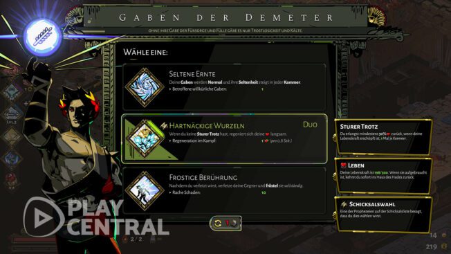 Wichtig: Achtet auf eure Lebenspunkte, denn Demeter regeneriert eure HP erst nach dem erstmaligen Ableben. Ihr kommt zwar stärker zurück, doch danach war es das dann.