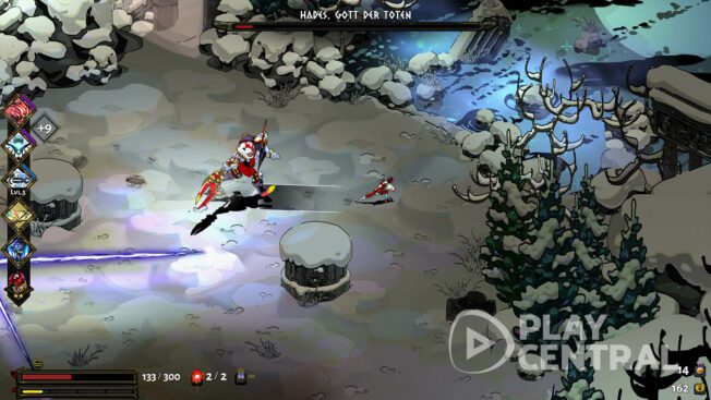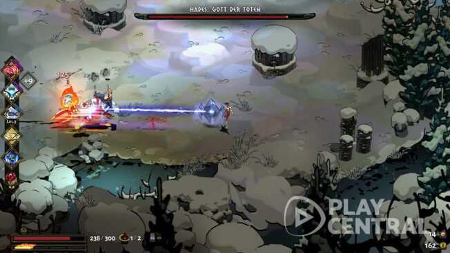 - Alle paar Sekunden tut es zudem eine Eisgranate, also eure Spezialität, die ihr dank euer Demeter-Gabe abfeuern könnt. Allerdings könnt ihr Hades auch ohne diese Fähigkeit besiegen. Sie ist jedoch nützlich, da sie ihn dank des Fröstelns verlangsamt. Das gilt zudem für die Schergen von Hades.