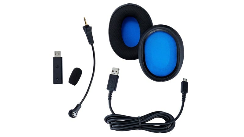 Geliefert wird das ATH-G1WL neben den Kopfhörern mit einem abnehmbaren Mikrofon, dem zugehörigen Windschutz, einem Satz ersetzbarer Ohrpolster, dem 2 Meter langen Ladekabel und dem nötigen kabellosen USB-Sendeempfänger vom Typ A.
