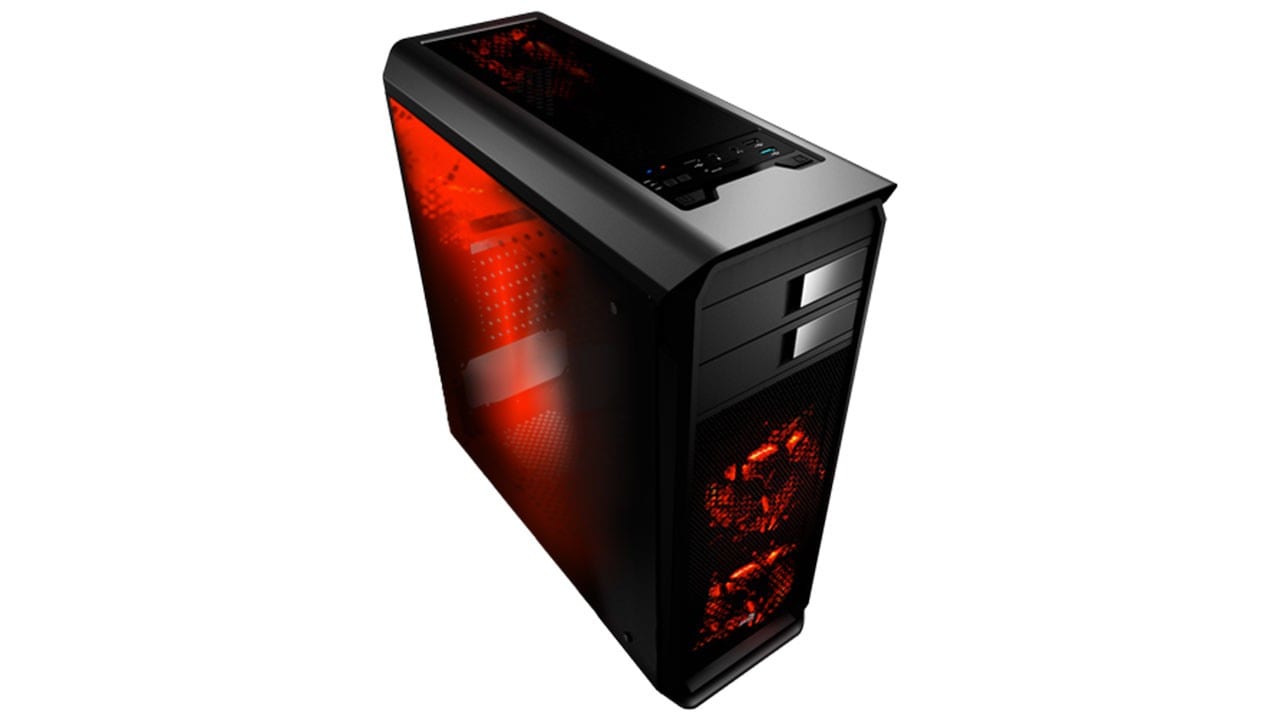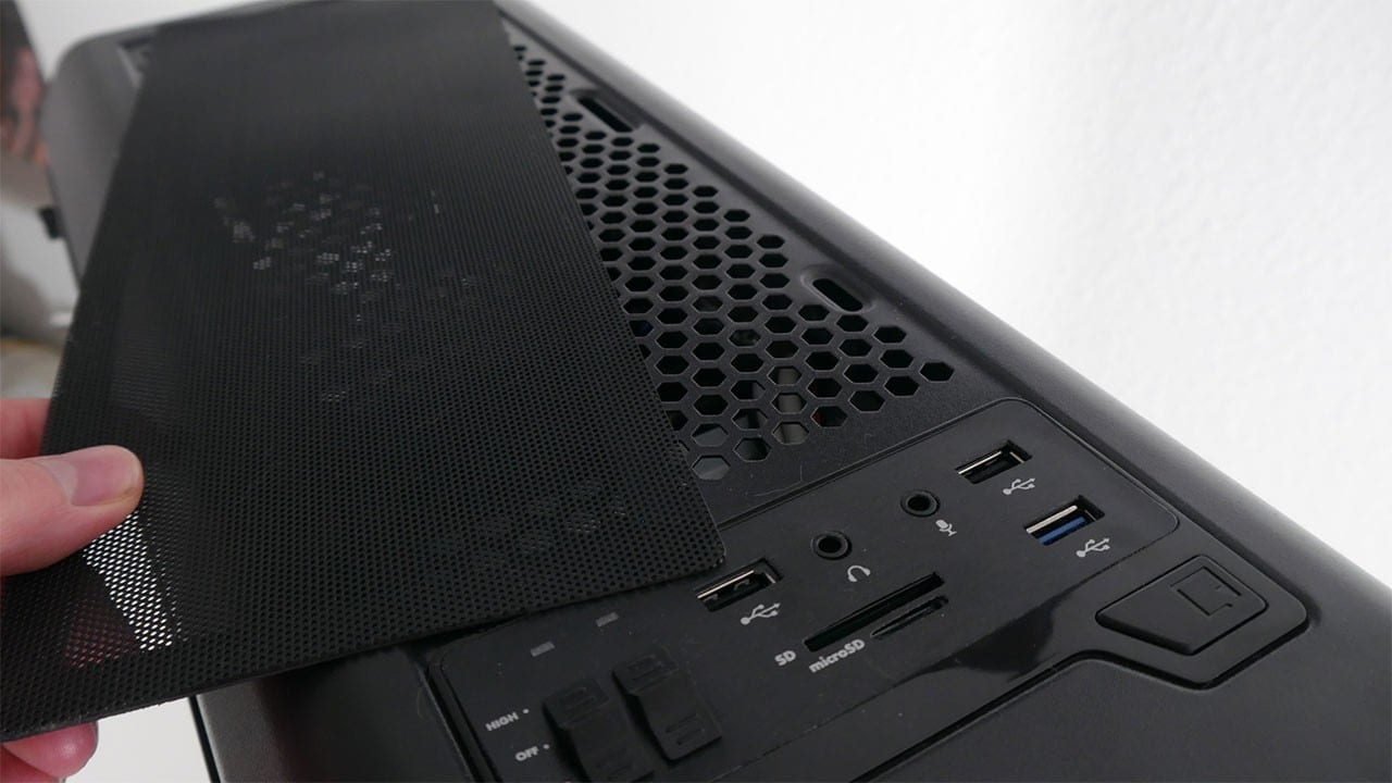 Sämtliche Komponenten befinden sich in dem Midi Tower Aero 500 Black Edition von Aerocool, das über ein Echtglas-Sichtfenster verfügt, da eingen guten Blick auf die verbauten Komponenten bietet. An der Front sind dabei zwei orange leuchtende 120-mm-LED-Lüfter angebracht, die Frischluft von außen in das Gehäuseinnere saugen. Der dritte 120-mm-Lüfter auf der Rückseite befördert die erwärmte Luft von Grafikkarte, Prozessor und Co. wieder nach außen. Über den Mesh-Elementen an der Vorderseite befinden sich zwei externe 5,25-Zoll-Slots für optische Laufwerke oder Lüftersteuerungen und Card-Reader. Hier hat HI-TECH ein Standard DVD-Laufwerk von LG eingebaut. Auf der Oberseite befinden sich ein Power- und Reset-Button sowie je ein Audio In/Out, ein USB-3.0, zwei USB-3.0 Ports und ein Kartenlesegerät. Außerdem befinden sich hier zwei Lüftersteuerungen mit denen sich die Geschwindigkeit sowie die Helligkeit der Lüfterbeleuchtung steuern lassen. Am Deckel befindet sich ein magnetischer, abnehmbarer Staubfilter.