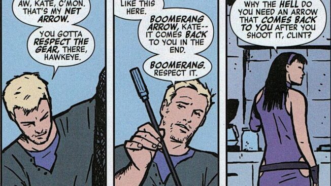 Im Laufe der Serie sehen wir, wie sowohl Hawkeye als auch Kate verschiedene Spezialpfeile einsetzen. In Folge 4 unterhalten sie sich über dieses Thema und unsere Nachwuchsheldin fragt ihn, ob er auch Bumerang-Pfeile besitzt. Die wären sehr praktisch, da sie schließlich zu ihm zurückfliegen würden und er sie nicht müßig einsammeln müsste.