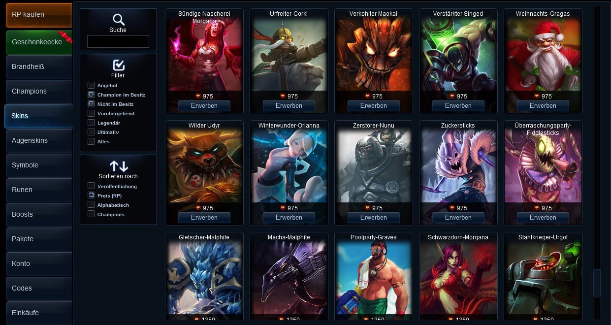 Als Vorreiter im Genre gilt aber natürlich weiterhin Riot Games mit League of Legends. Als das wohl erste Studio, das vollends auf den Verkauf ausschließlich optischer Verbesserungen vertraute, setzte das Studio 2009 auch einen Standard bei der Preispolitik. Dabei lassen die letzten Seasons vor allem den Schluss zu, dass sich die Masse an Spielern am Shop nicht zu stören scheint. Der Vergleich zu Heroes of the Storm fällt wegen der Echtgeld-Währung Riot Points aber schwer, da mit dem Kauf von Riot Points natürlich ein Mengenrabatt einhergeht. 5 € entsprechen 840 RP, was wohl als guter Maßstab dienen kann. Den Skin-Verkauf starten die Entwickler vereinzelt bei 260 RP, in der Regel aber bei 520 RP, also etwa 3,10 €, was sich mit Dota 2 gut vergleichen lässt. Viele der Skins gibt es außerdem für 975 RP, also zirka 5,80 €. Etwa 80 % der Skins sind zu diesem Preis oder günstiger zu haben und liegen damit deutlich unter den HotS-Preisen. Die Luft nach oben reicht bis zu 3250 RP, sprich etwa 19,34 €.