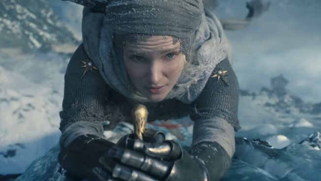 Allerdings könnte es sich hierbei natürlich auch einfach nur um irgendeinen Wasserfall handeln, der keine größere Bedeutung hat. Kurz darauf sehen wir Galadriel, wie sie sich an einer vereisten Felswand festklammert. Womöglich derselbe Ort, vielleicht ganz woanders (eventuell die Eiswüste Helcaraxë?). Fest stehen dürfte aber, dass Galadriel in der neuen „Herr der Ringe“-Serie jede Menge Screentime bekommt. Eventuell ist sie hier schon als Kommandantin der Armee unterwegs.