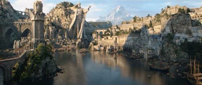 Der Trailer geht los und wir sehen als erstes wohl mit an Sicherheit grenzender Wahrscheinlichkeit Númenor. Dabei handelt es sich um ein Inselkönigreich der Menschen samt heiligem Berg Meneltarma und die gezeigte Stadt dürfte Rómenna sein, in der zum Beispiel Elendil und Isildur wohnen. Bei denen handelt es sich wiederum um Aragorns Vorfahren.
