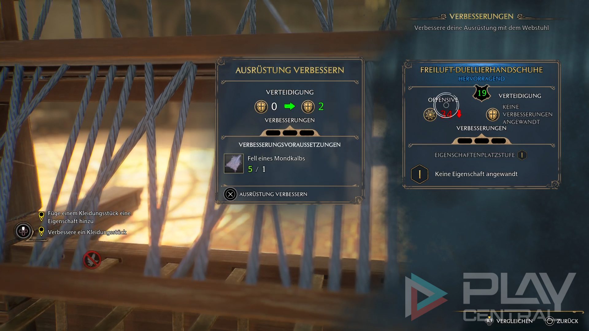 An einem verzauberten Webstuhl könnt ihr eure Ausrüstung dank magischer Materialien von Tierwesen verbessern. Normalerweise besitzen eure Ausrüstungsgegenstände einen Hauptwert der Offensive oder Defensive.