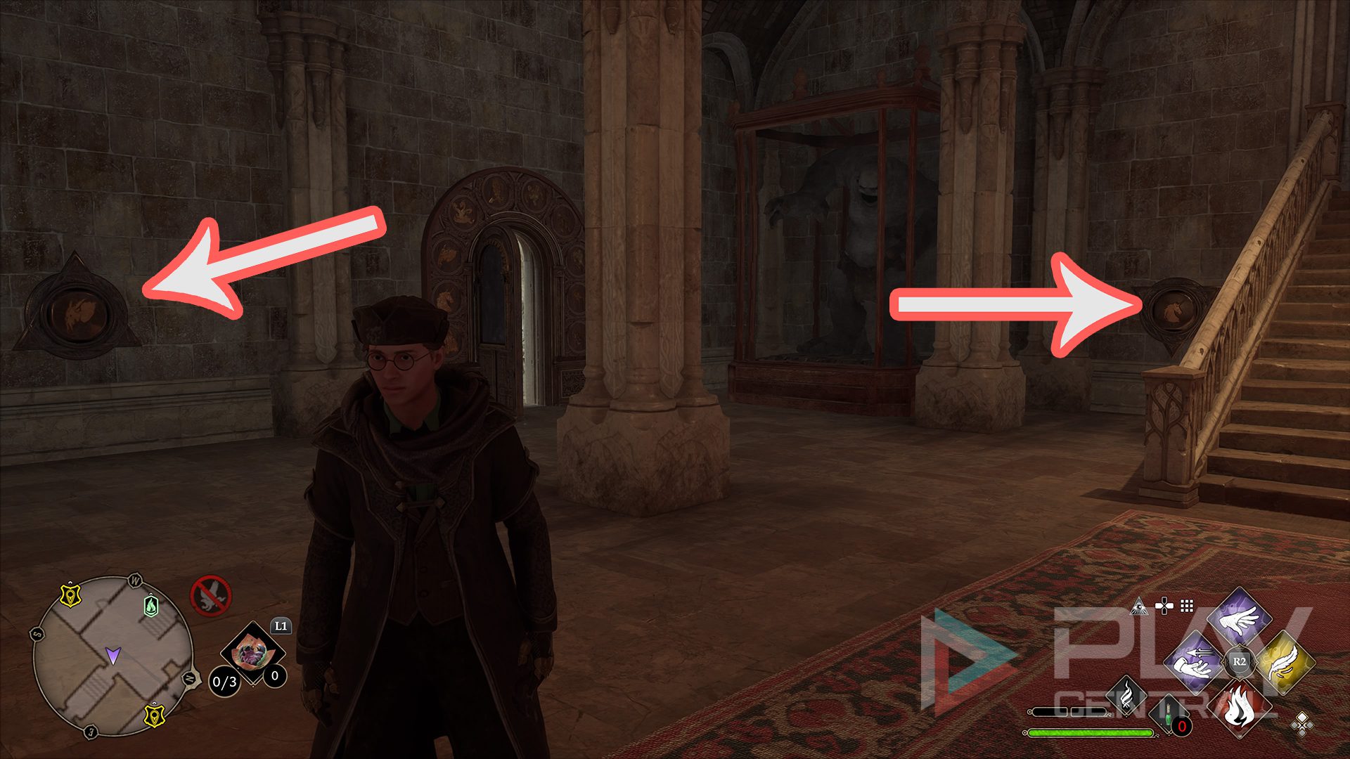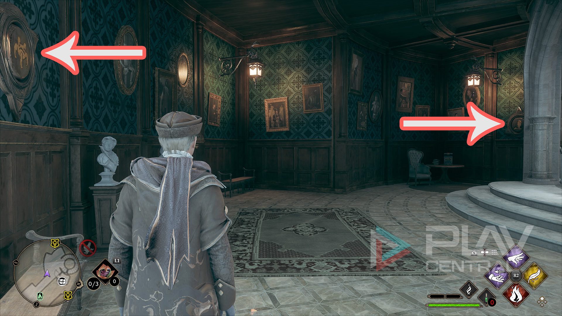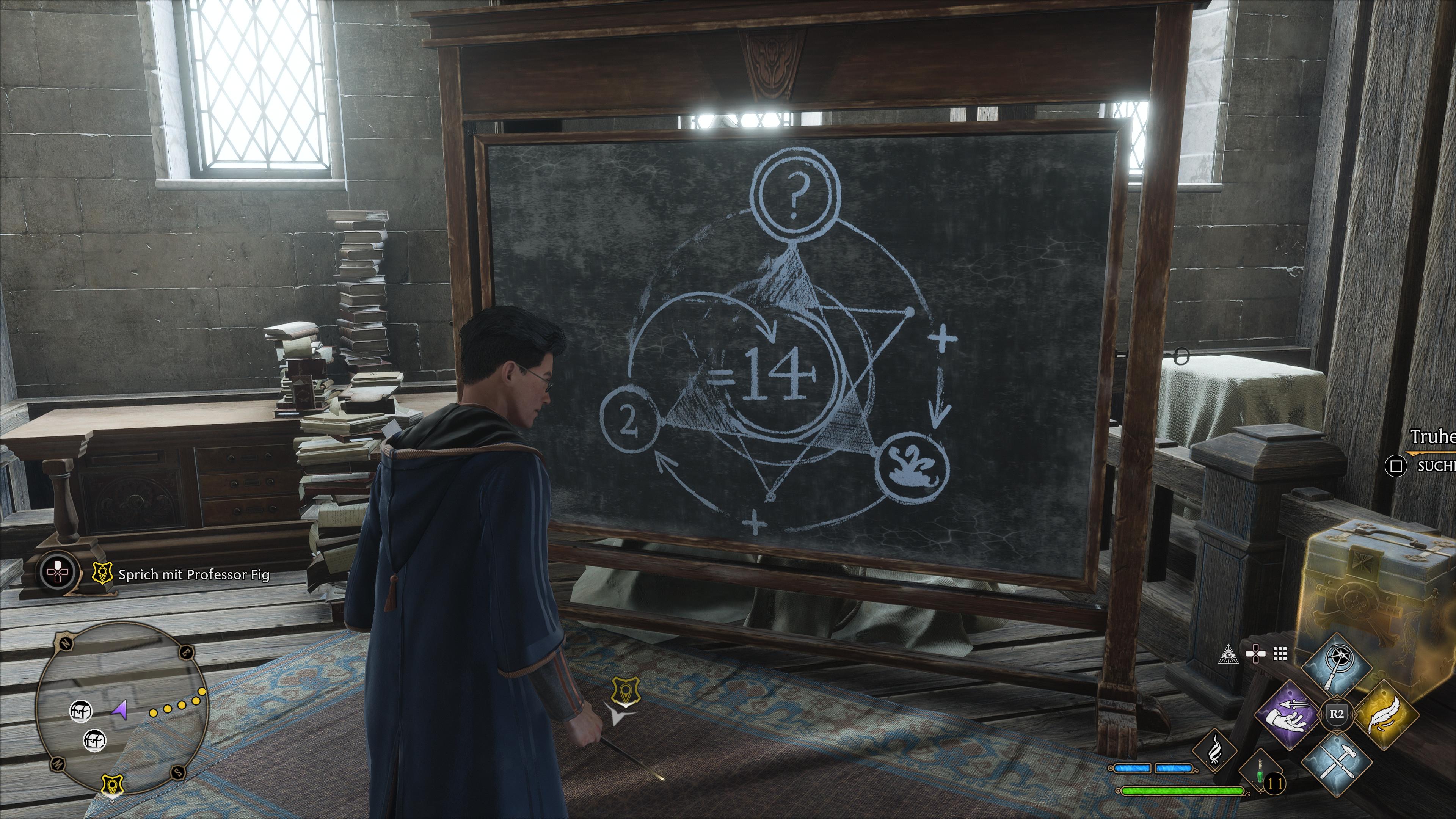 In dem Raum hinter der Tür findet ihr unter anderem eine neue Handbuchseite (Gorgonenporträt). Außerdem findet ihr ein Gemälde, auf dem offenbar Medusa zu erkennen ist, die gerade einen Zauberer zu Stein erstarren lasst. Interagiert ihr mit dem Bild, müsst ihr die richtige Taste (Finite!) drücken, um nicht ebenfalls für einen kurzen Moment in Stein verwandelt zu werden und auf den Boden zu fallen.