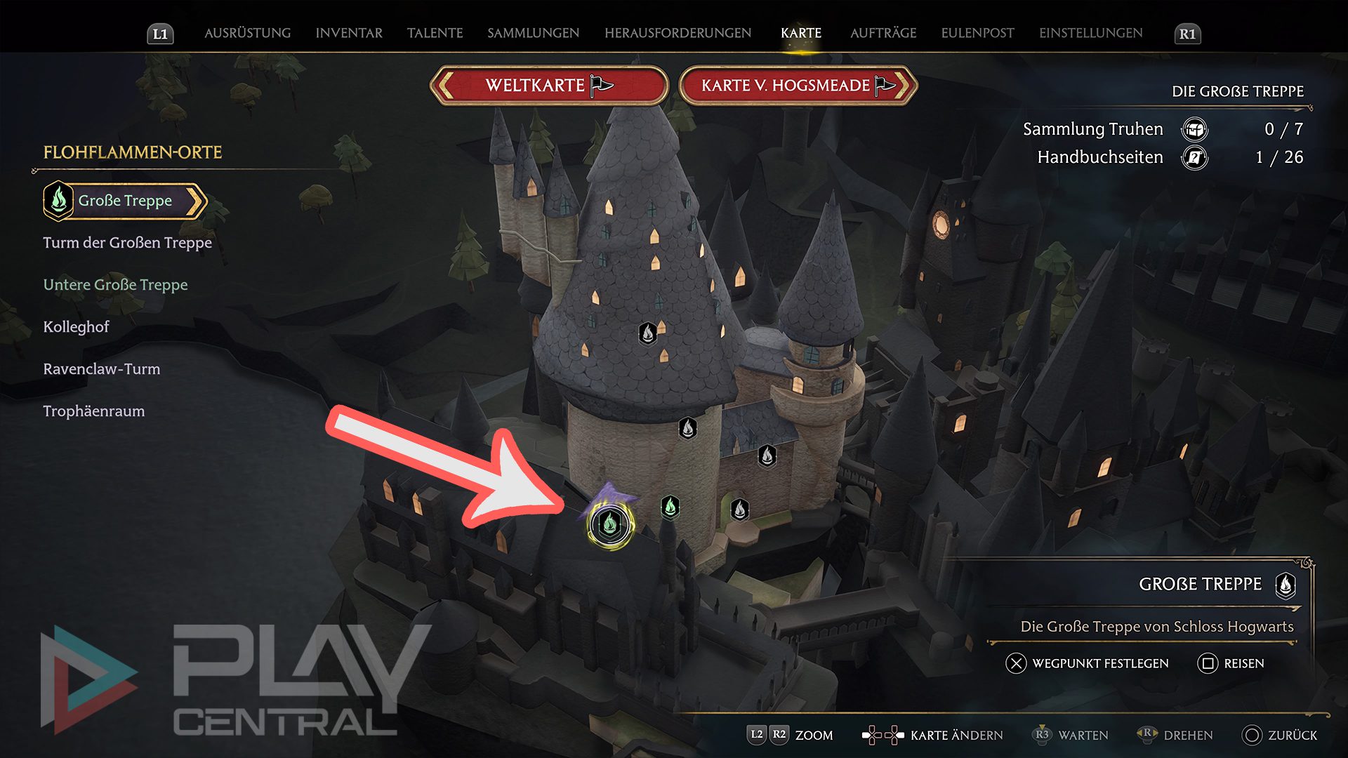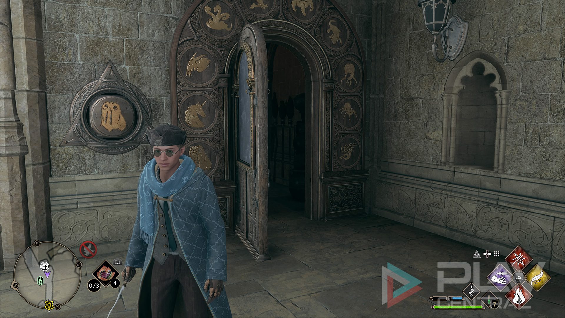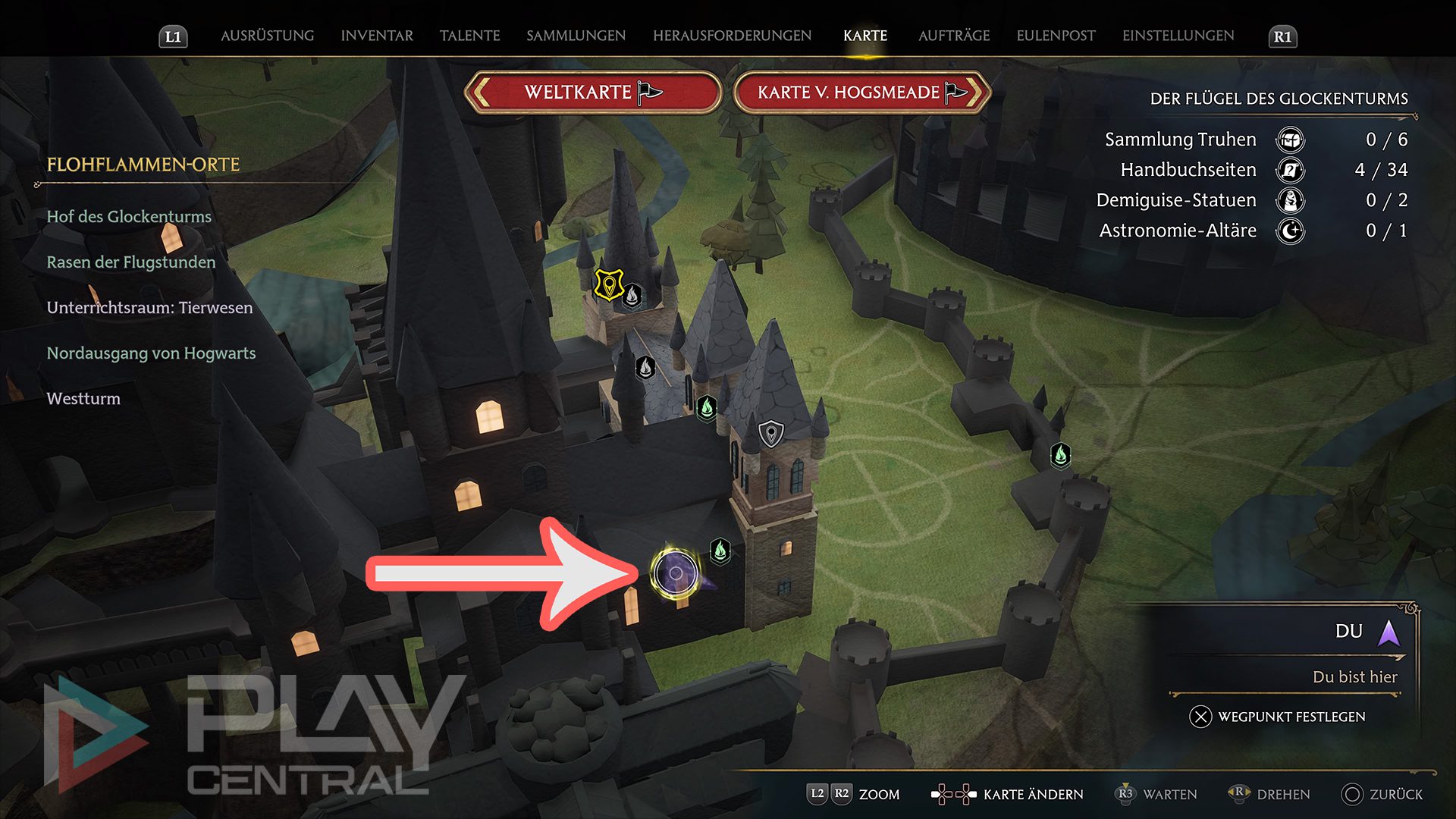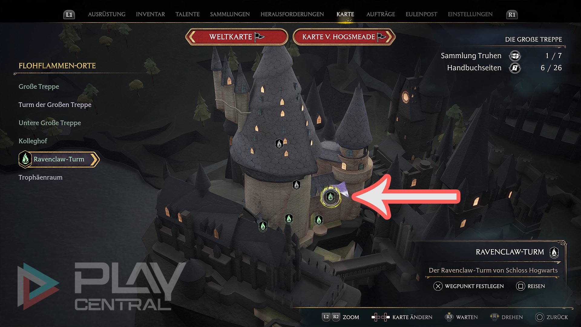 Reist zu dem Flohflammen-Ort Ravenclaw-Turm und einige wenige Meter den Gang entlang. Auf der rechten Seite findet ihr ein weiteres Tür-Rätsel. Bei dazugehörigen Tafel sind in dem Durchgangraum verteilt, also nicht schwer zu finden.