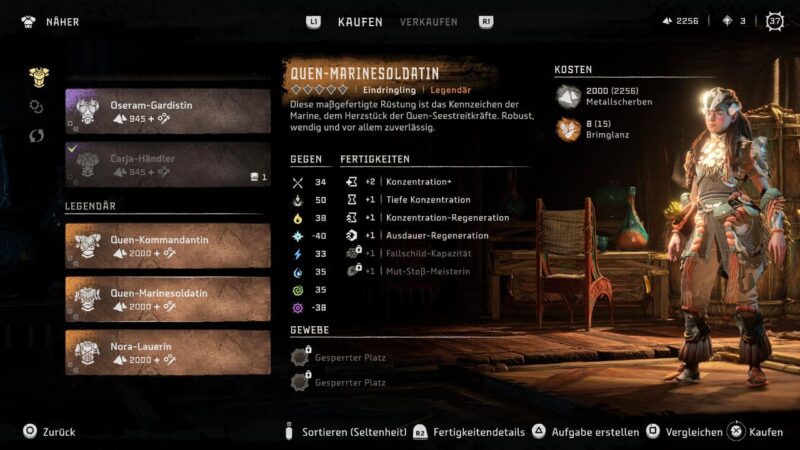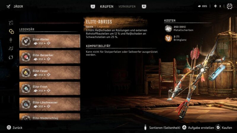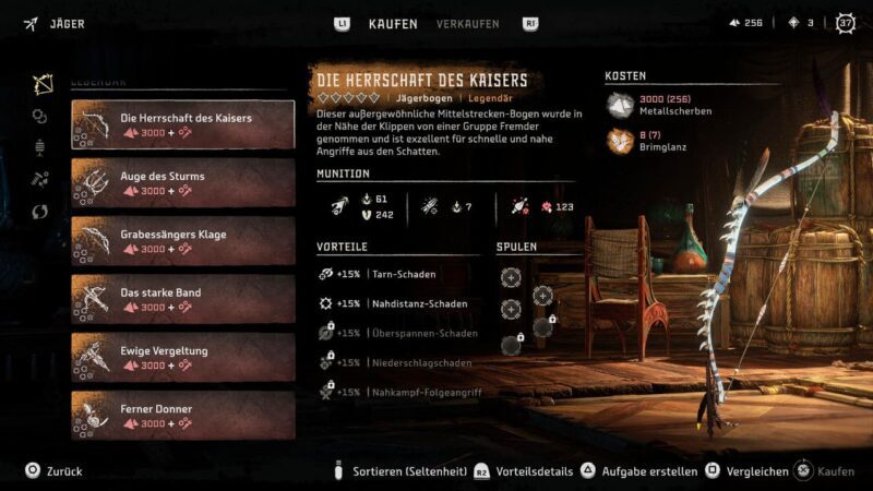 Beim Jäger in der Quen-Siedlung, die Aloy quasi als Operationsbasis in „Burning Shores“ dient, könnt ihr beispielsweise frische Outfits und Waffen ersteigern. Besonders schön hieran: Alle Gegenstände, die ihr gegen Brimglanz (und viele Metallscherben!) eintauschen könnt, haben den Seltenheitsrang „Legendär“ und gehören somit in die höchste Kategorie in „Horizon Forbidden West“!