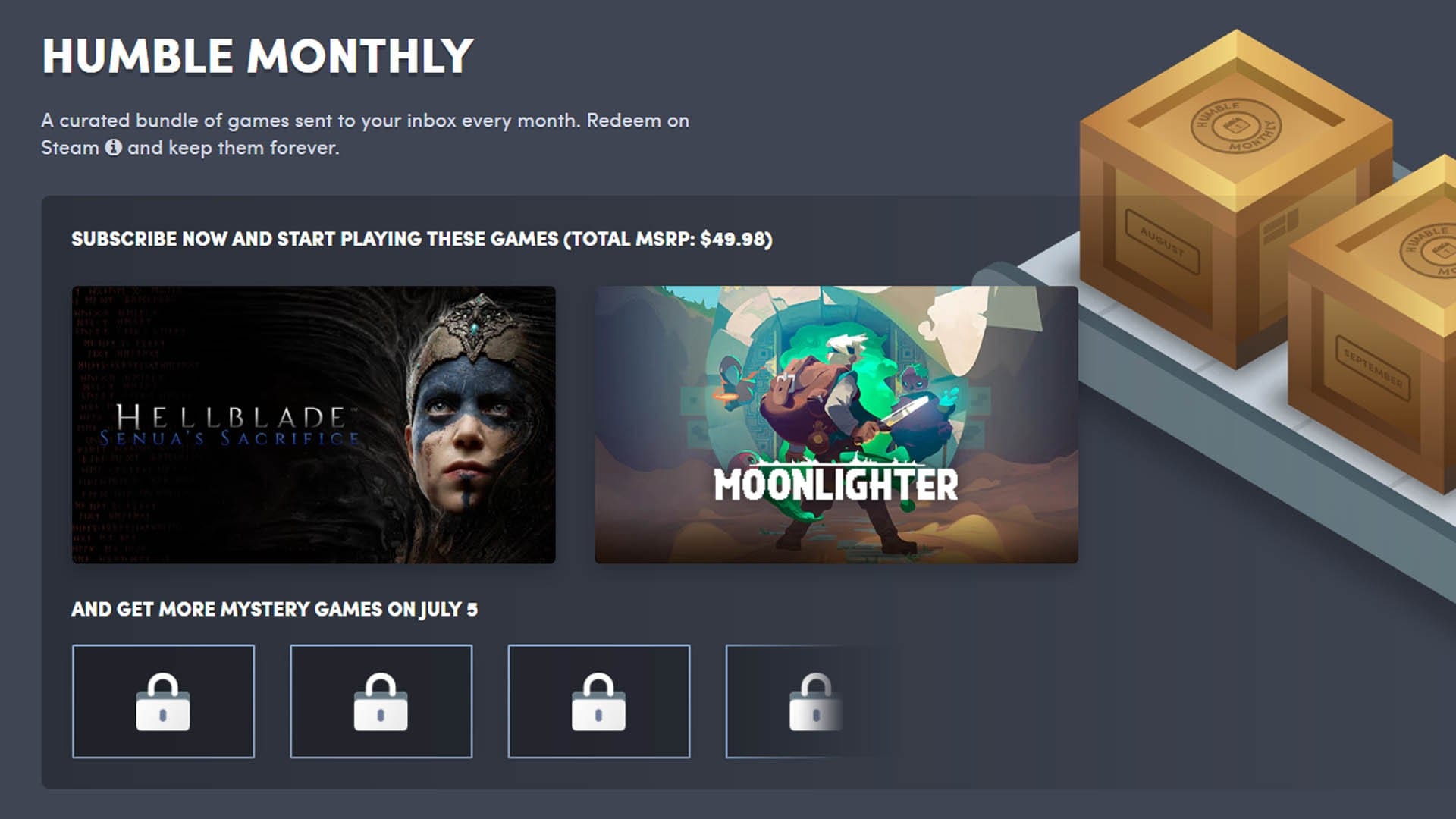 Im Monat Juli gibt es im Humble Monthly eine besondere Spieleperle. Schon jetzt ist bekannt, dass „Hellblade: Senua's Sacrifice“ und „Moonlighter“ im Bundle enthalten sind, die ihr für zehn Euro erwerben könnt.