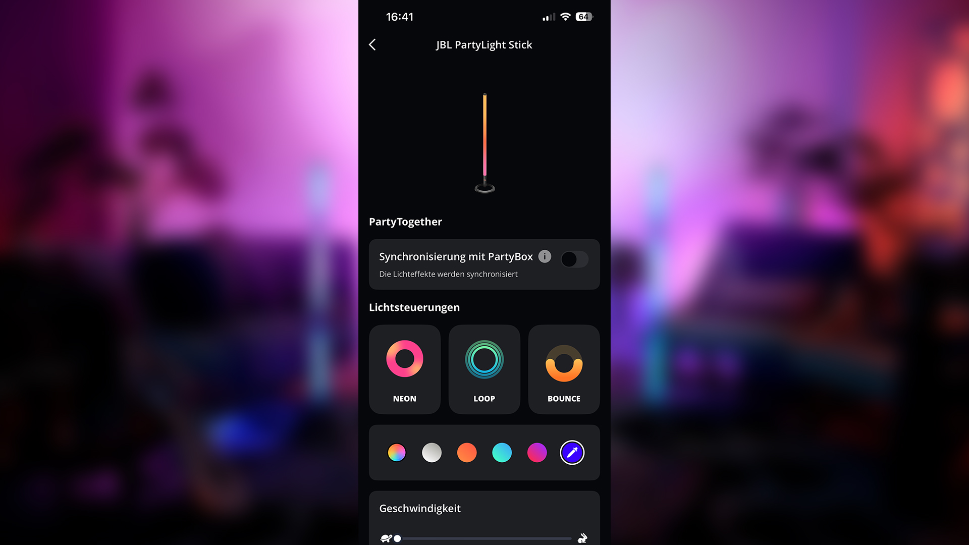Gesteuert wird das Ganze über die JBL PartyBox App, die als zentrale Schaltstelle für kompatible Lautsprecher und Lichtelemente dient. Der PartyLight Stick wird dort automatisch erkannt und lässt sich direkt konfigurieren. Wer bereits JBL-Produkte nutzt, findet sich sofort zurecht, denn die Benutzeroberfläche ist übersichtlich aufgebaut und selbsterklärend.