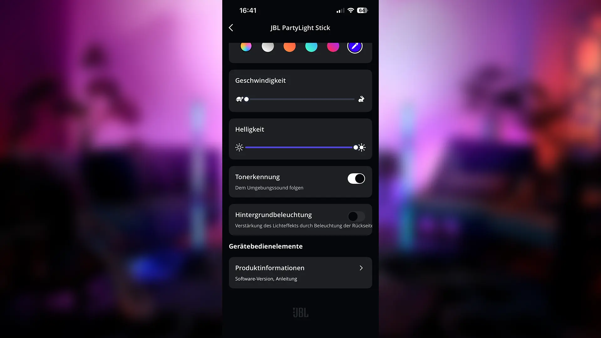 Gesteuert wird das Ganze über die JBL PartyBox App, die als zentrale Schaltstelle für kompatible Lautsprecher und Lichtelemente dient. Der PartyLight Stick wird dort automatisch erkannt und lässt sich direkt konfigurieren. Wer bereits JBL-Produkte nutzt, findet sich sofort zurecht, denn die Benutzeroberfläche ist übersichtlich aufgebaut und selbsterklärend.