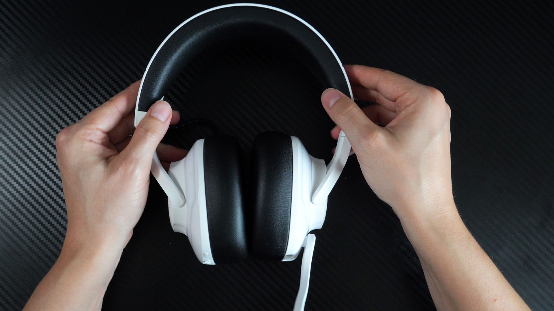 Im Inneren des Beutels befindet sich das hauptsächlich in weißem Kunststoff gehaltene Headset mit schwarzen Ohrpolstern, die aus Memory-Schaum bestehen. Und auch der Kopfbügel ist innen mit Memory-Schaum gefüttert.