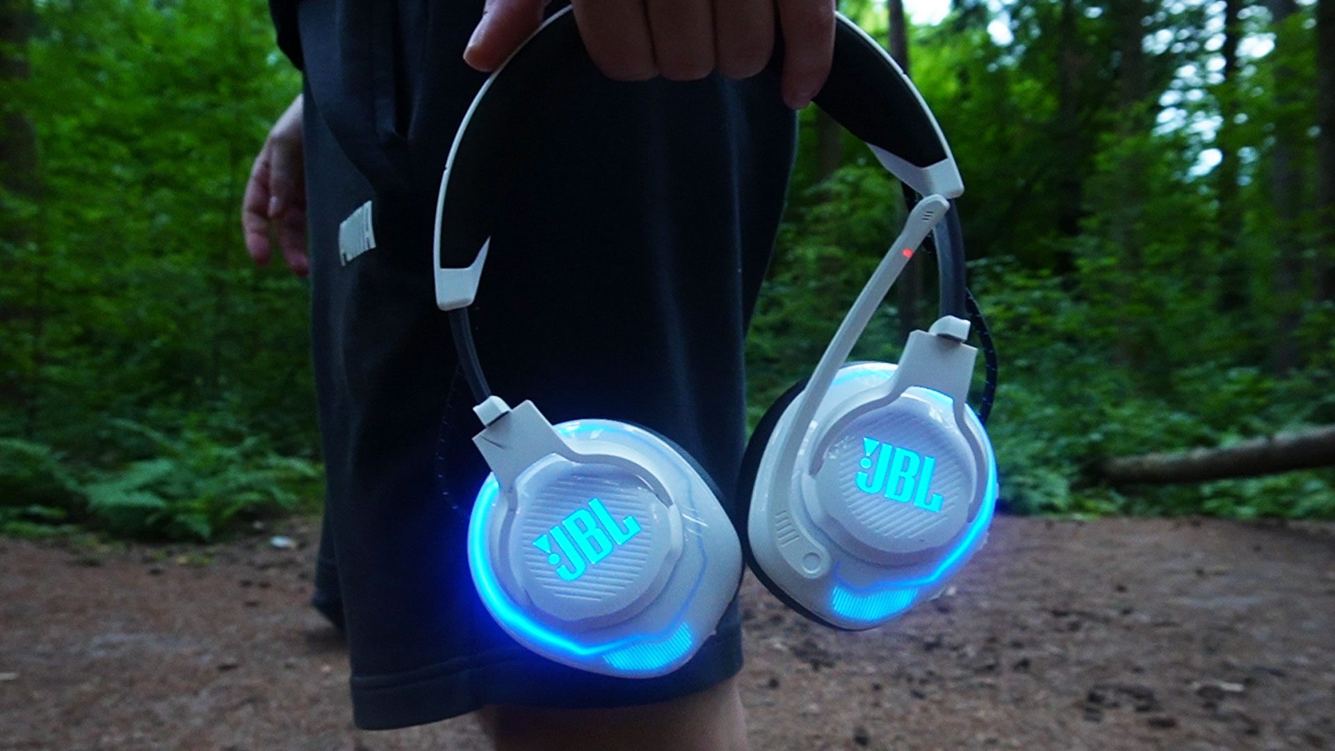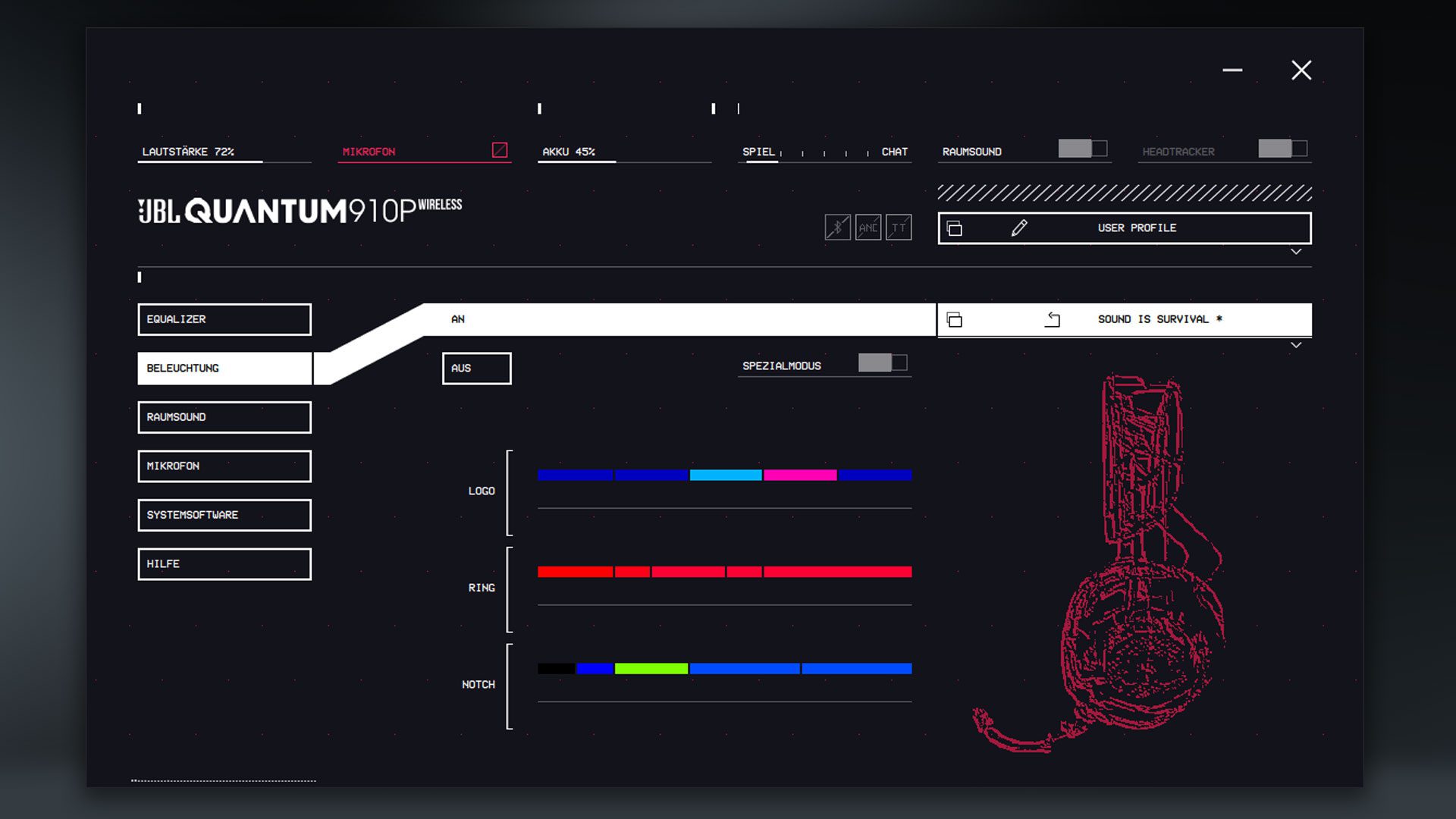 Eine wahre Rampensau ist das JBL Quantum 910P aber nicht durch sein markantes Design, sondern durch ein Feature, das beim anfänglichen Auspacken gar nicht auffallen kann. Erst wenn ihr das Headset mit einem Endgerät verbunden habt, tritt die in mehrere Zonen unterteilte RGB-Beleuchtung ihren auffälligen Dienst an. Und die hat es wahrlich in sich!