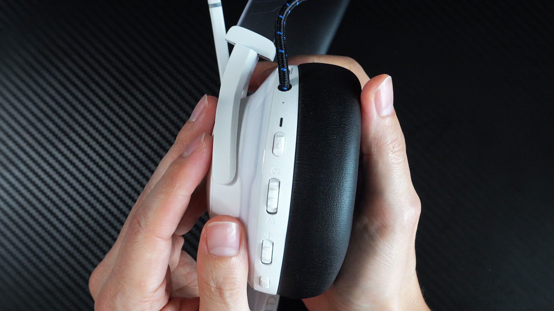 Der Großteil der Tasten und Bedienungselemente befinden sich bei den Quantum-910-Modellen auf der Rückseite der linken Ohrmuschel. Lediglich ein Regler sowie eine weitere Taste lassen sich auf der rechten Seite verorten.