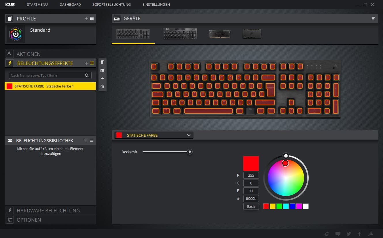 Gezielter könnt ihr die Beleuchtung sowie kleinere Einstellungen in der iCUE-Software einstellen. Zusätzlich gibt es außerdem Beleuchtungseffekte bei iCUE-integrierten Spielen. Dadurch wird euch durch die jeweilige Beleuchtung der Tastatur zum Beispiel angezeigt, dass ihr im Spiel nur noch über wenig Gesundheit verfügt.