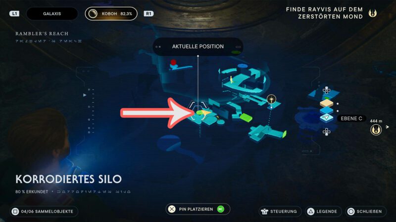 Wenn ihr im Silo angekommen seid, müsst ihr noch ein paar Wallrides und Wandslides hinlegen, bis ihr weiter nach unten kommt. Spätestens wenn ihr dann in dem großen Raum mit der Seilrutsche angekommen seid, könnt ihr die Jedi-Meditationskammer bereits weiter unten erkennen.