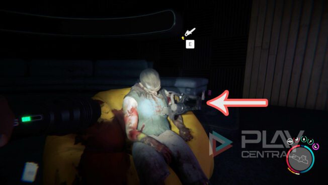 Die Kettensäge findet ihr schließlich im letzten Raum in der Nähe einer Leiche, die an einem gelben Sitzkissen lehnt.