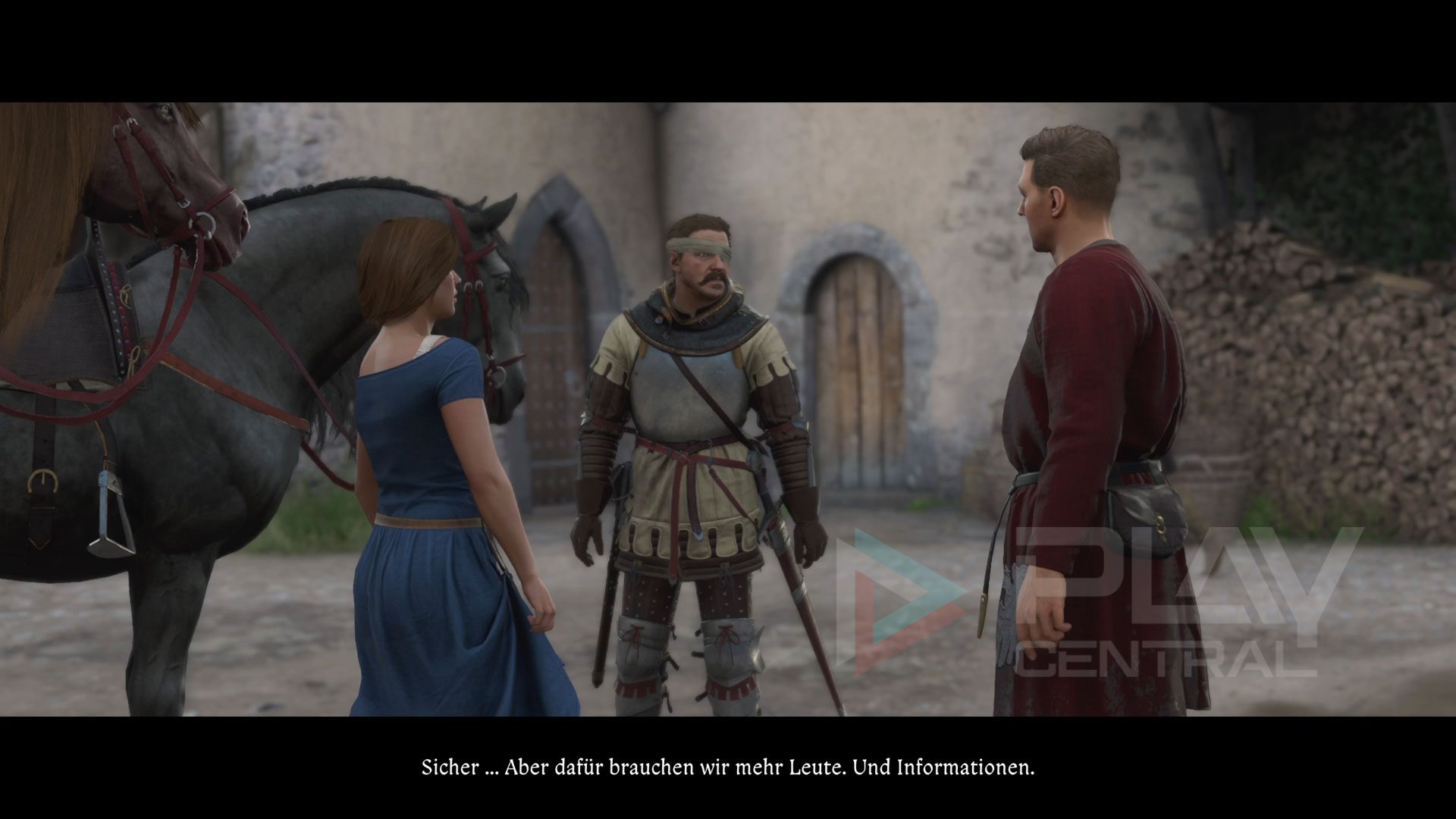 Sprecht mit eurem Verbündeten, um zu erfahren, dass er erst später zu dem Gespräch stoßen wird. Außerdem möchte er Katharina darum bitten, die Pferde zu satteln. Schließlich wisse man nie, wann mit Ärger zu rechnen ist – wie recht er hat.
