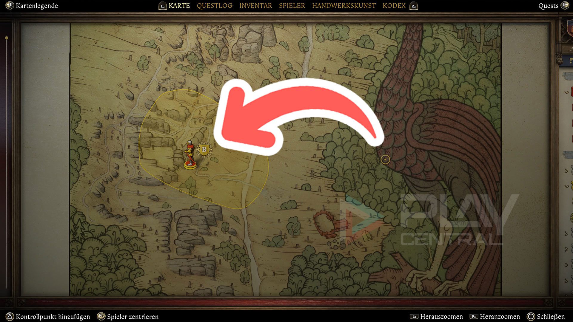 Als nächstes solltet ihr euch also auf die Suche nach diesem Grab machen, das sich ein Stück weiter nordwestlich der Hütte befindet. Das Suchgebiet ist auf eurer Karte eingezeichnet. Solltet ihr aber Probleme dabei haben, den genauen Ort zu finden, schaut euch einfach die Markierung auf der folgenden Karte an.