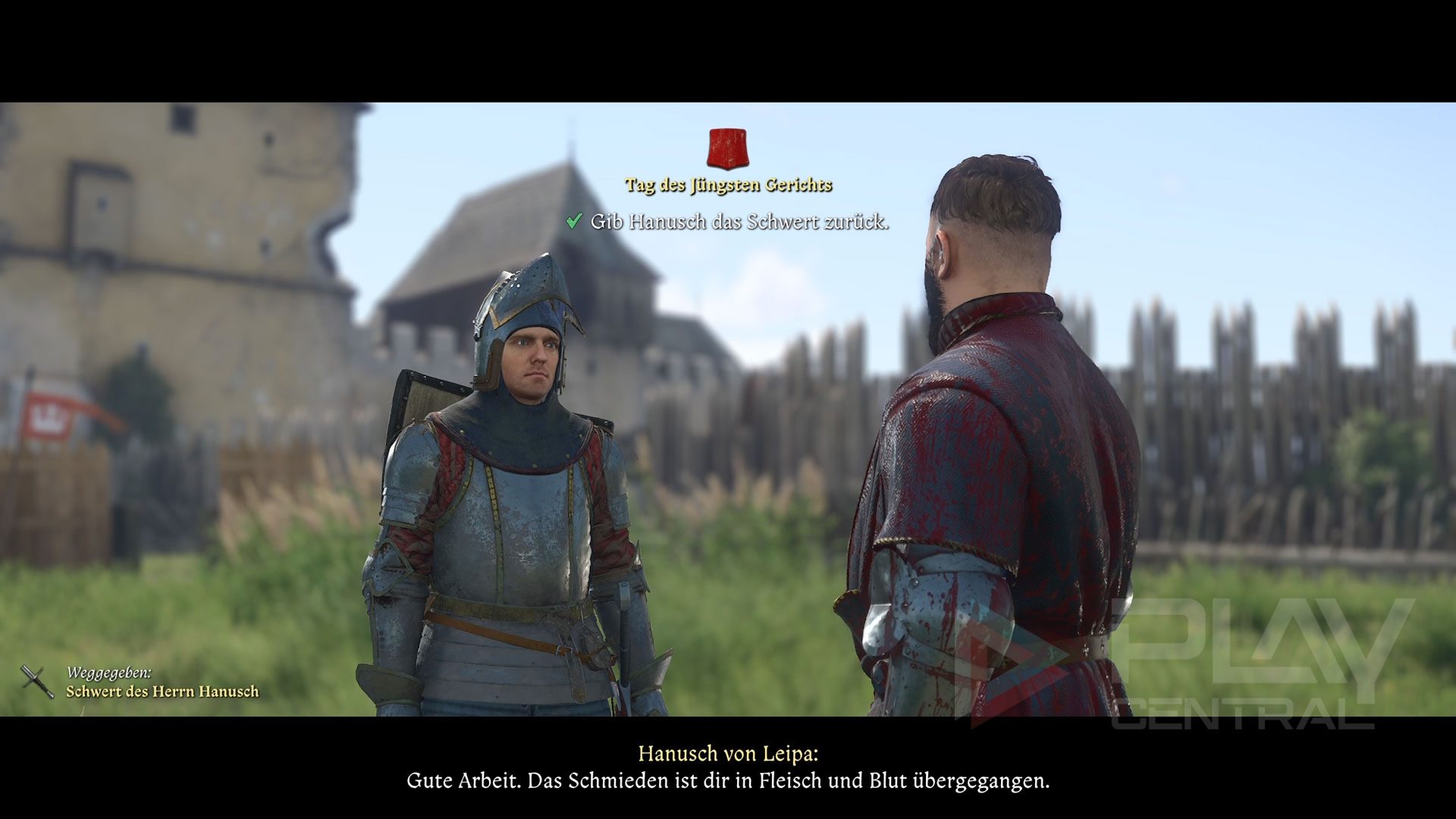 Nach dem Kampf bittet Hanusch von Leipa euch, sein Schwert zu schärfen. Er selbst führt in der Zwischenzeit ein vertrauliches Gespräch mit Capon. Wartet, bis Hanusch sein Gespräch beendet hat und bringt ihm dann das frisch geschärfte Schwert zurück. Hanusch nutzt die Gelegenheit, um mit euch zu sprechen. Er weist euch an, dafür zu sorgen, dass Capon an der bevorstehenden Hochzeit teilnimmt.