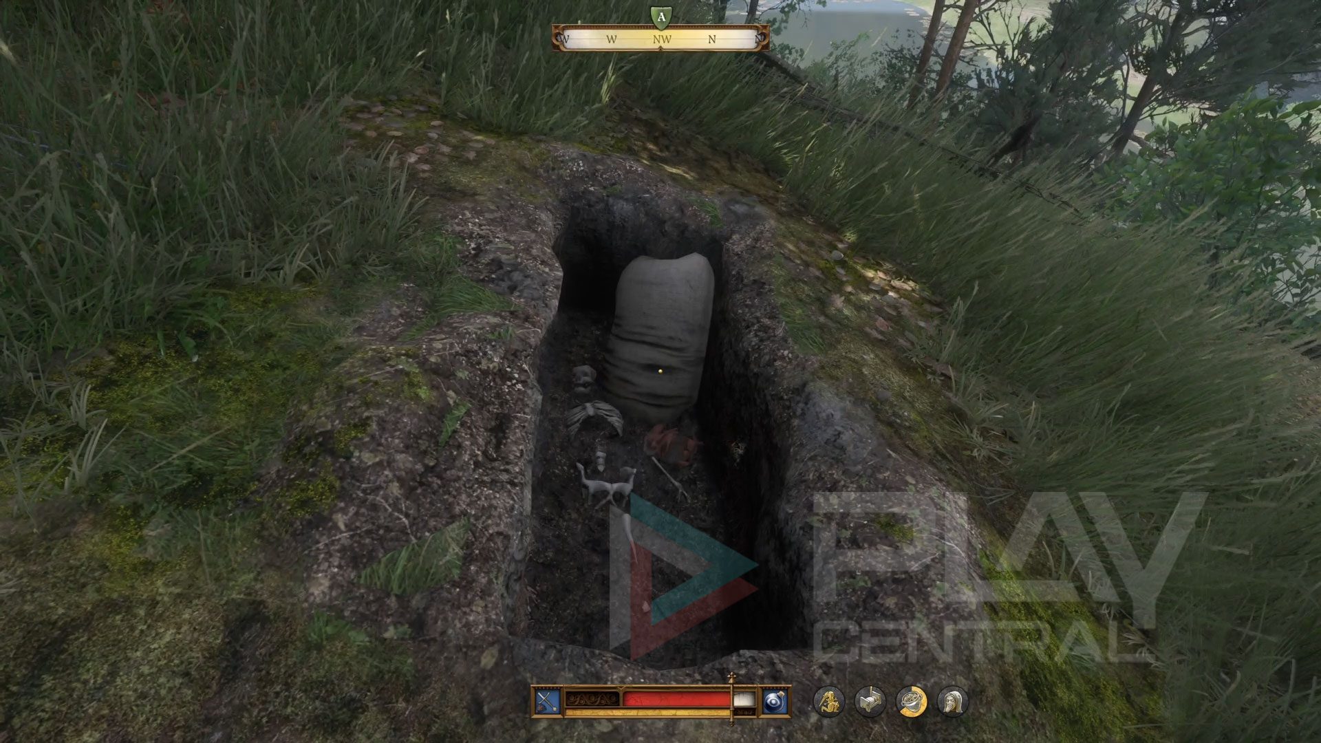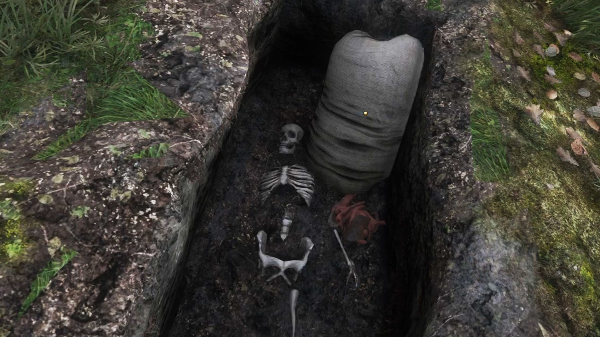 Mit einer Schaufel im Inventar könnt ihr an dieser Stelle mit dem Graben beginnen. Zum Vorschein kommt schließlich ein Skelett sowie ein großer Mehlsack, in dessen Inneren ihr die folgenden Gegenstände findet: