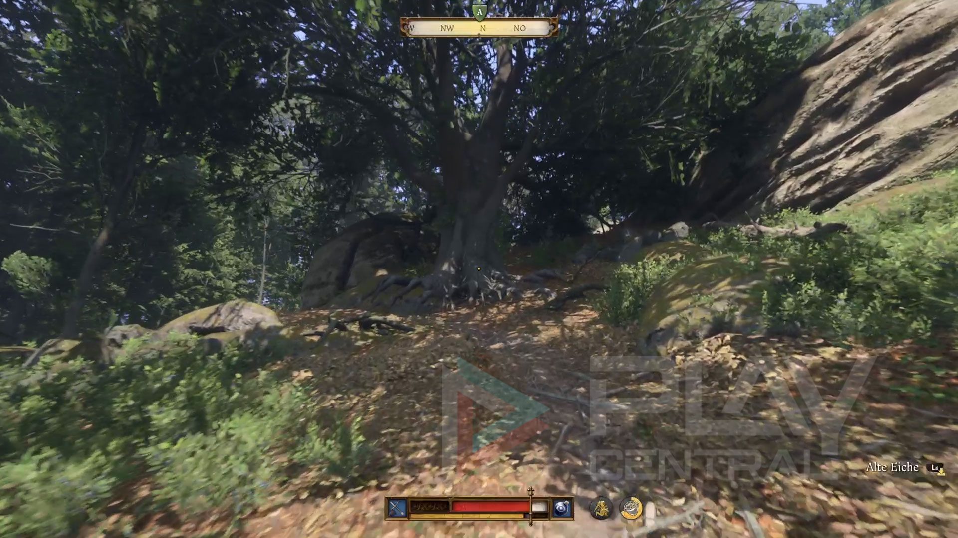 Vom Steg aus folgt ihr also dem kleinen Trampelpfad, der sich später zwischen den Felsen hindurch den Hügel hinaufschlängelt. Nach wenigen Metern stoß ihr direkt rechts von dem kleinen Weg auf eine mächtige Eiche, die man eigentlich kaum übersehen kann.