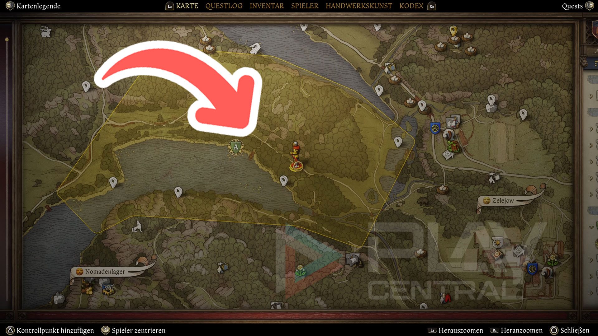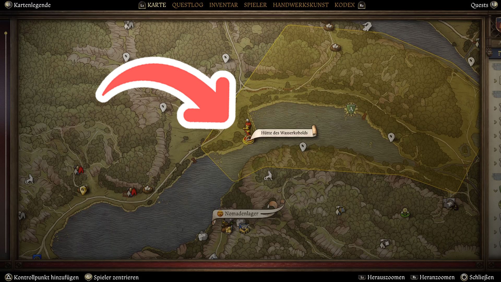 Sobald ihr die Quest angenommen habt, wird ein Großteil des Steinturmsees als Suchgebiet markiert. Doch selbst über eure Karte könnt ihr bereits erkennen, wo sich am Ufer potenzielle Stege befinden. Gesucht ist der Kai am nordöstlichen Seeufer – zwischen der Missionsmarkierung („A“) und dem rechten Pin.