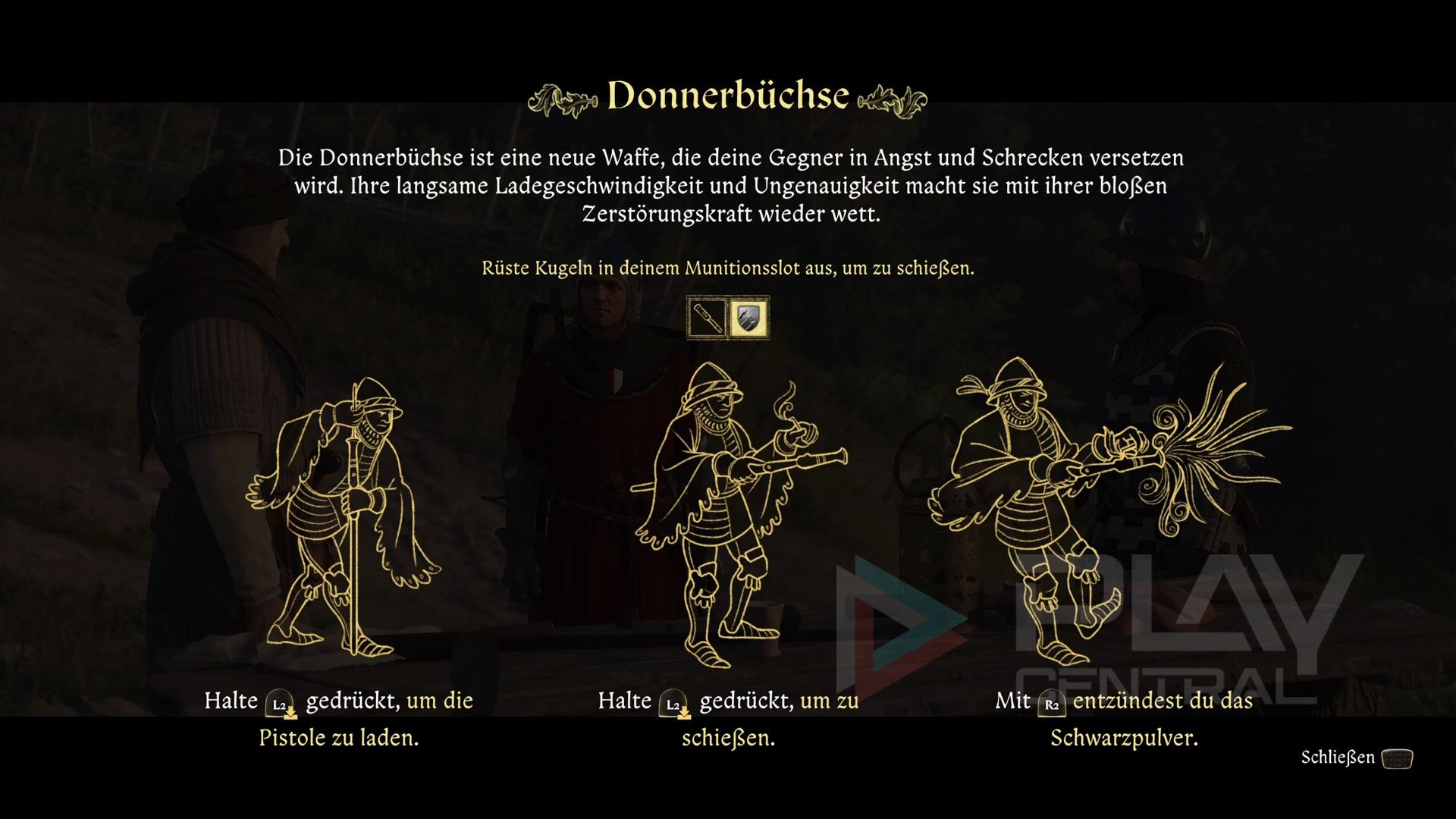 Godwin stellt euch im Anschluss dem Soldaten Hertl vor, der euch eine Einführung in den Umgang mit einer Donnerbüchse (mittelalterliches Gewehr) gibt. Nach Abschluss des Tutorials erhaltet ihr euer erstes Exemplar als Belohnung!