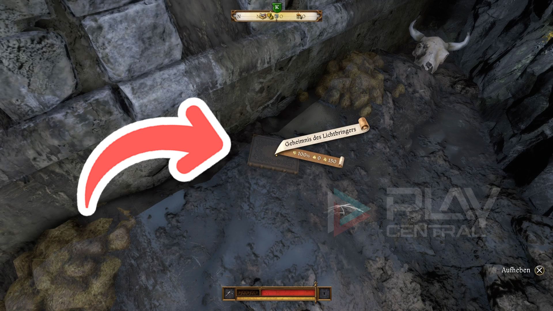 Das Buch, Geheimnis des Lichtbringers, liegt einige Meter entfernt auf dem Boden. Als nächstes müsst ihr das Buch nur noch Kreyzl zurückbringen. Dieser befindet sich mittlerweile wieder bei seiner Mühle.
