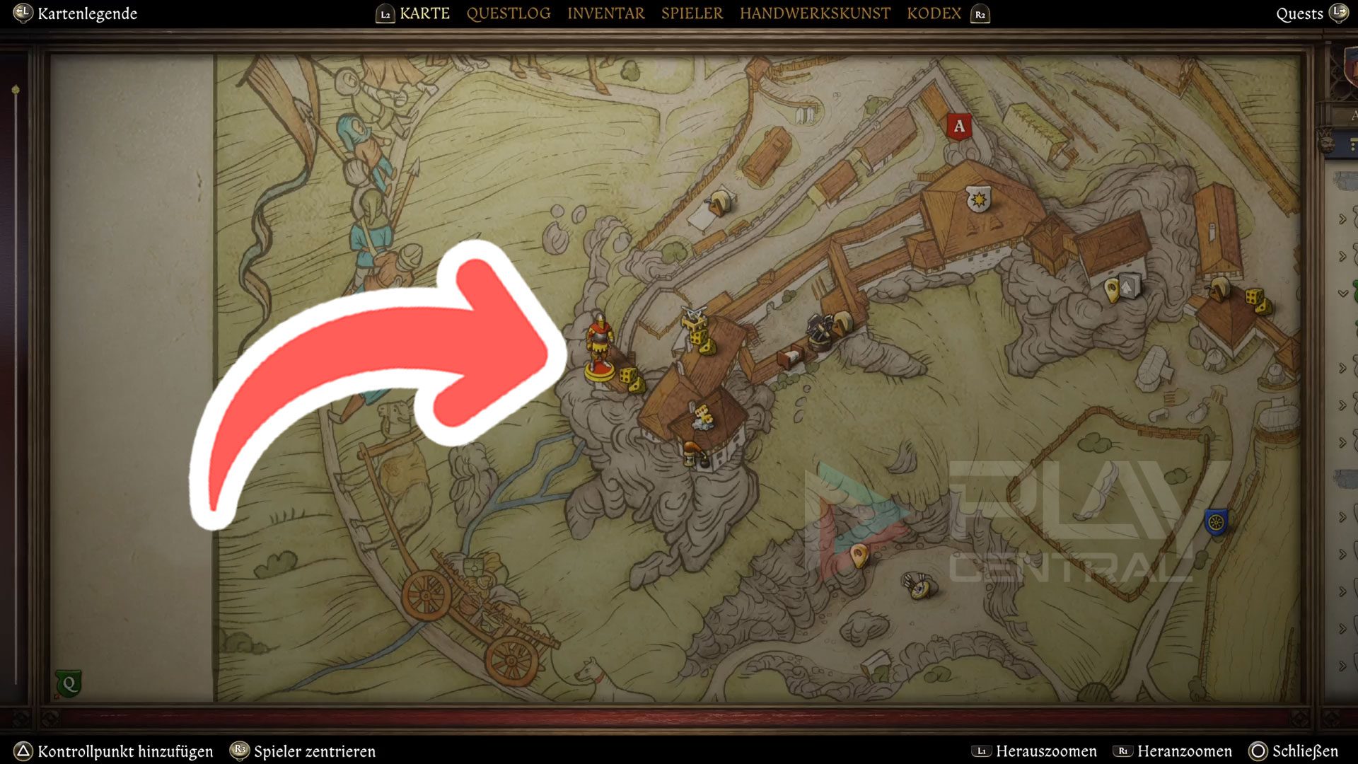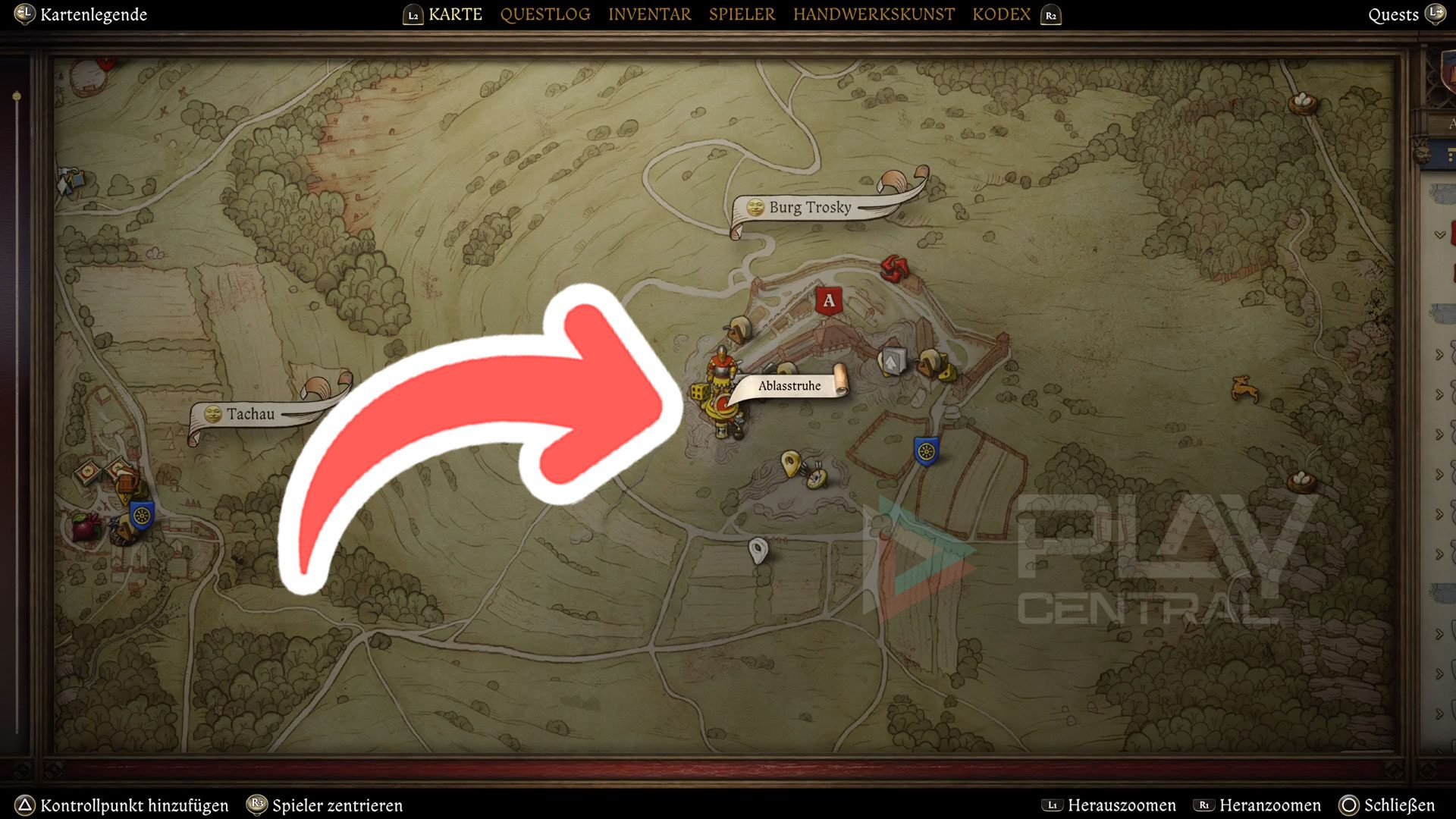 Eure erste Anlaufstation ist wieder der Schreiber Erazim, der sich in einem der oberen Gemächer des südwestlichen Bereichs der Burg befindet. An diesem Raum seid ihr auf dem Weg zu Hauptmann Thomas bereits vorbeigekommen. Darin befindet sich außerdem die Ablasstruhe, die auf der Karte markiert sein sollte (siehe Bild unten).