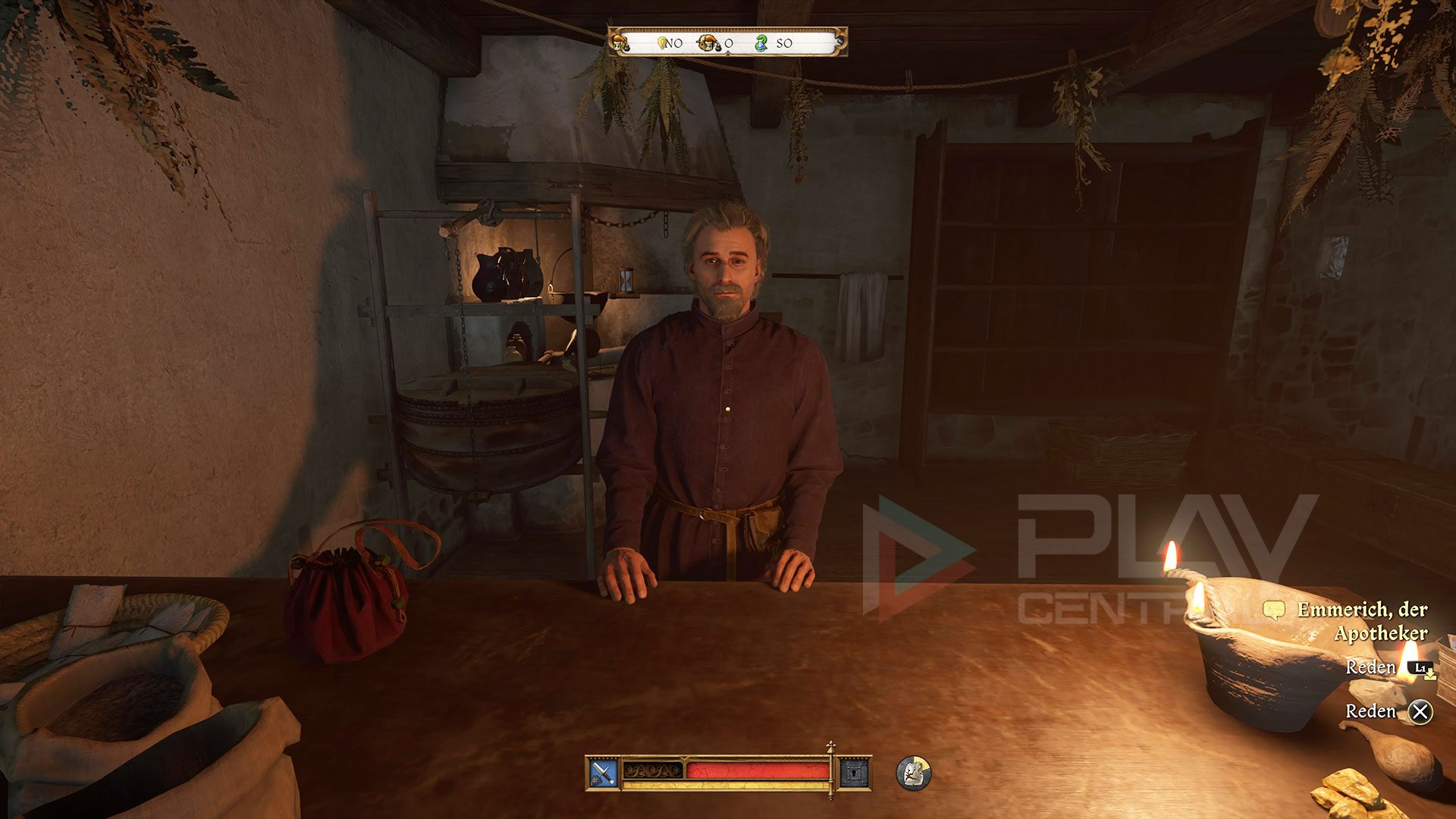 • Stallbursche Hersch: Der Gehilfe ist tagsüber im Lagerhof am Fuße der Burg zu finden. Im hinteren Garten habt ihr während der vorherigen Mission die Wucherblume für das Medikament eingesammelt. Er schläft in dem Haus gegenüber.