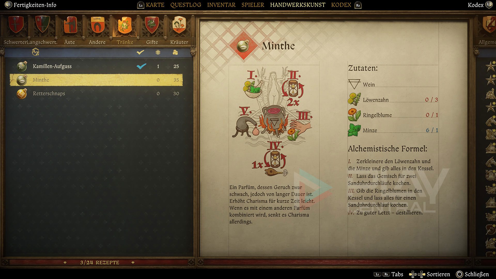 Seid ihr in Besitz der Anleitung, lernt das Rezept über das Menü und geht dann in die kleine Hütte auf dem Grundstück. Hier befindet sich ein Alchemistisch, den ihr jederzeit nutzen könnt. Ihr benötigt für die Herstellung 3x Löwenzahn, 1x Ringelblume und 1x Minze. Einige Zutaten könnt ihr direkt beim Apotheker erwerben, Löwenzahn findet ihr eigentlich überall in der Spielwelt und habt ihr vielleicht sogar bereits in eurem Inventar.