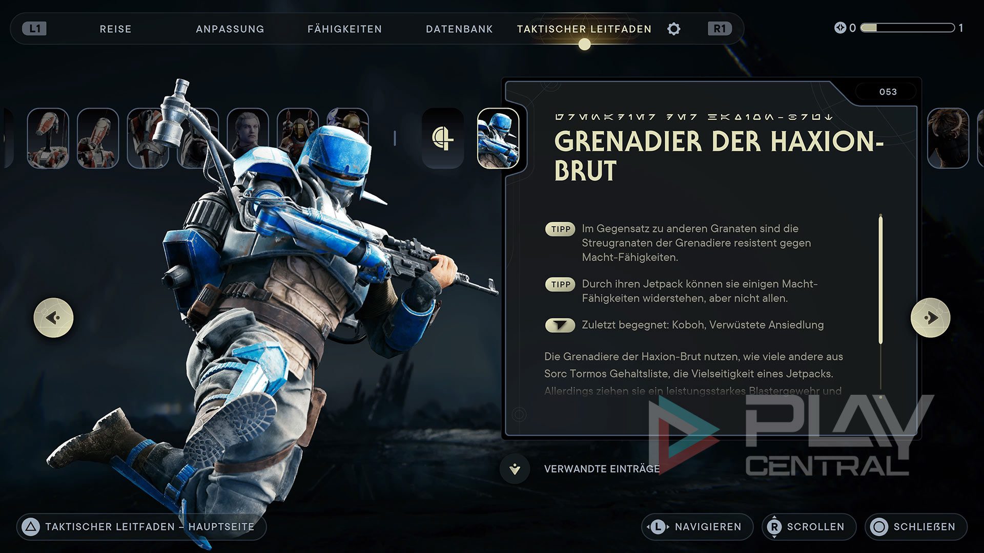 Wo zu finden? Im Rahmen der Hauptquest Nachforschung: Tanalorr auf Koboh verschlägt es Cal nach Steinnadeln in den Bereich Verwüstete Ansiedlung. Sobald ihr das Gebiet betreten habt, werdet ihr auf einem kleinen Felsplateau von dem Kopfgeldjäger Grenadier der Haxion-Brut angegriffen.