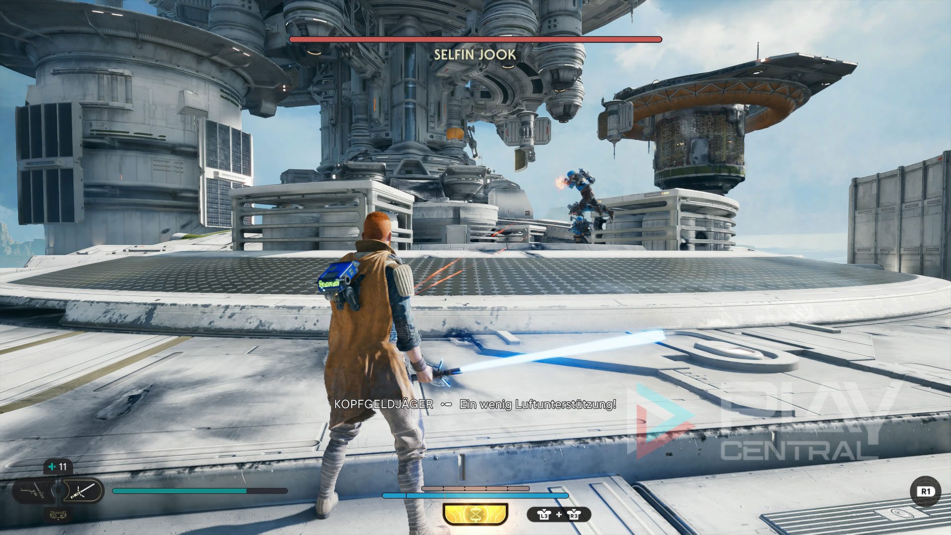 Im Kampfe gegen den Revolverhelden habt ihr genügend Platz, um seinen Granaten in Ruhe auszuweichen, per Macht lassen sich diese nämlich leider nicht zurückschleudern. Mit dem Lichtschwert lassen sich seine Schüsse wunderbar parieren. Geht am besten frühmöglich in den Nahkampf über und überrascht ihn mit schnellen Kombos. Passt aber auf seine Pistolenschlag-Kombinationsattacke auf.